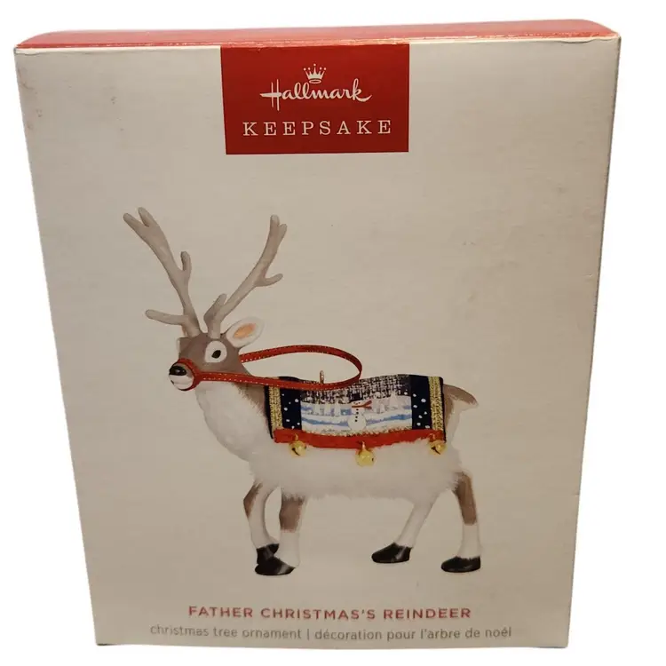 Welcome the wonder of the season with this handsome Christmas tree ornament. The regal reindeer features a fabric saddle blanket trimmed with faux fur and bells and is adorned with a charming winter wonderland scene featuring a snowman. Limited Quantity, Low Production Artist-crafted by Joanne Wright. Approx. Size in Inches: 4.29 x 5.5 x 2.11 New in the original box. Original box may have minor wear due to storage.