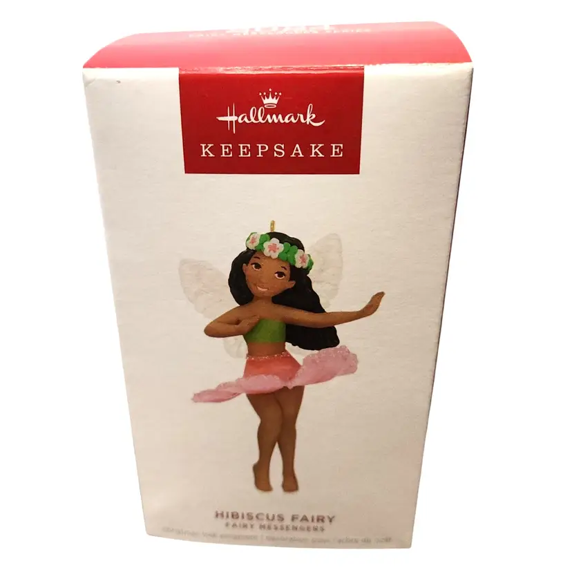 Brighten the holidays when you display this sweet Hibiscus Fairy Christmas tree ornament with your Fairy Messengers collection. The pretty pixie with a flower headpiece in her wavy brown hair wears a flower petal inspired dress and features sparkly glitter accents on her iridescent wings.