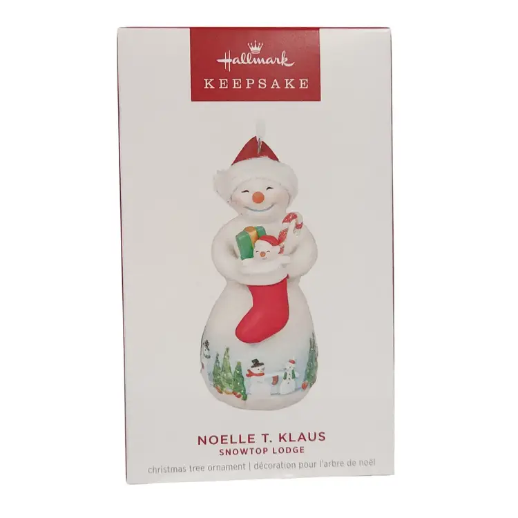 Celebrate the season of holiday decorating and gift-giving with this Noelle T. Klaus Christmas tree ornament that shows off your festive cheer. The porcelain snow lady holds a filled stocking brimming with gifts, a tiny snowman and a glittery candy cane. A sweet scene of snowmen sharing stockings with their friends and family adorns the base. •20th in the Snowtop Lodge Keepsake Ornament series. •Artist-crafted by Joanne Wright. •Porcelain Christmas ornament •Approx. Size in Inches: 1.61 x 3.74 x 1.95 New in the original box. Original box may have minor wear due to storage.