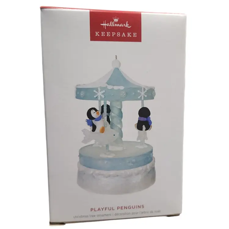 Imagine the sparkling delight of the midway in the middle of a winter wonderland! Riding on an icy carousel with fish ice sculptures for seats, this trio of playful penguins is full of wintry fun. The charming Christmas tree ornament lights up, and the carnival ride carries the penguin pals around in circles to the music of "Jingle Bells." Press the button on the Magic Sound, Light, and Motion ornament to see it illuminate, watch the carousel turn and hear music.