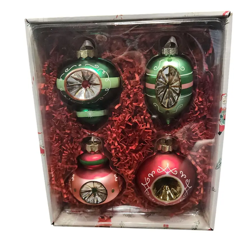 These intricately designed vintage-inspired glass ornaments bring a nostalgic charm to your holiday decor. Adorned with vibrant green and pink hues, they feature reflective accents and delicate hand-painted detailing. Perfectly boxed, they create a festive ambiance, evoking the timeless beauty of Christmases past. Ideal for tree decorating or gifting. • Hand-Painted Glass Construction • Vibrant Green & Pink Colors • Reflective & Textured Accents • Packaged In Festive Display Box • Vintage-Inspired Design New in the original box. Original box may have minor wear due to storage.