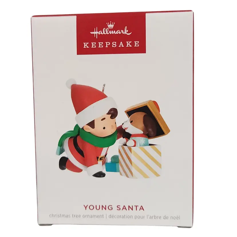What was Santa Claus like as a kid, before he grew into the jolly old elf we all know and love? This cute Christmas tree ornament of Young Santa and his playful pup gives you a chance to relive your own favorite childhood holiday memories with Santa as the star. This year's addition to the series features Santa discovering his puppy jumping out of a gift box. • 3rd in the Young Santa Keepsake Ornament series. • Artist-crafted by Sheyda Abvabi Best. • Approx. Size in Inches: 3.03 x 2.5 x 1.65 New in the original box. Original box may have minor wear due to storage.