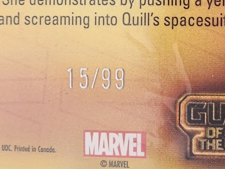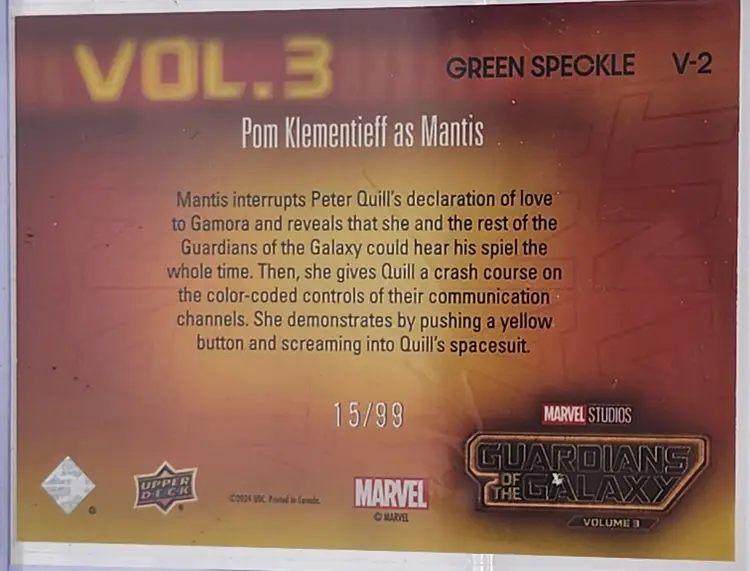 The product is a 2024 Upper Deck Guardians of the Galaxy Vol 3 trading card featuring a green speckle design numbered 15 out of 99. This non-sport trading card is part of the Marvel Cinematic Universe (MCU) franchise, specifically the Guardians of the Galaxy series. It is manufactured by Upper Deck and does not come autographed. It is a highly collectible item for fans of the Guardians of the Galaxy series and Marvel enthusiasts looking to add a rare and unique piece to their trading card collection.
