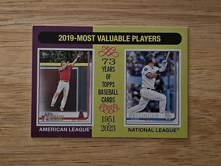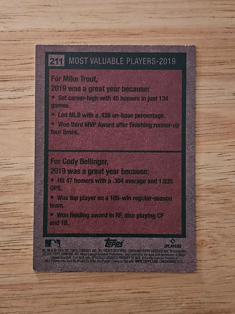 2024 Topps Heritage Baseball 2019 Most Valuable Players Mike Trout Cody Bellinger Los Angeles Angels Los Angeles Dodgers Card #211.