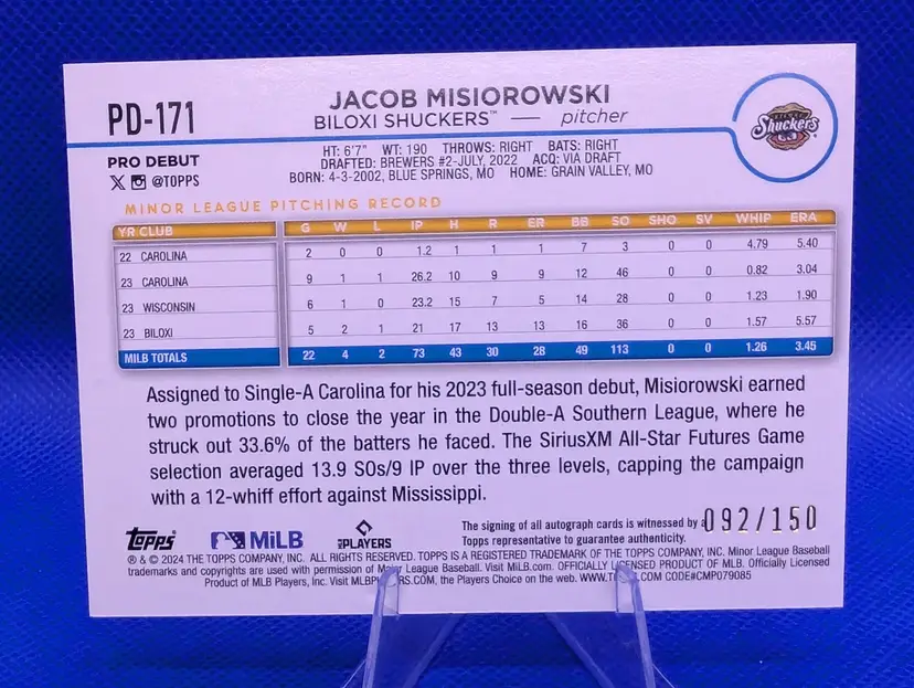 2024 Topps Pro Debut Milwaukee Brewers- Jacob Misiorowski Auto Blue Refractor /150 Clear auto, very nice color match US Shipping Included Insured BMWT