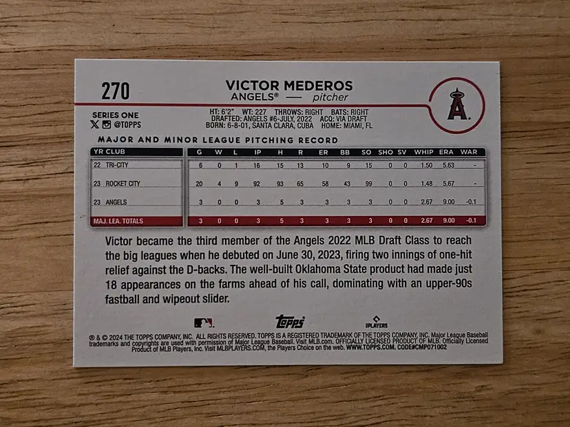 2024 Topps Series One Baseball Rookie RC Victor Mederos Los Angeles Angels Card #270.