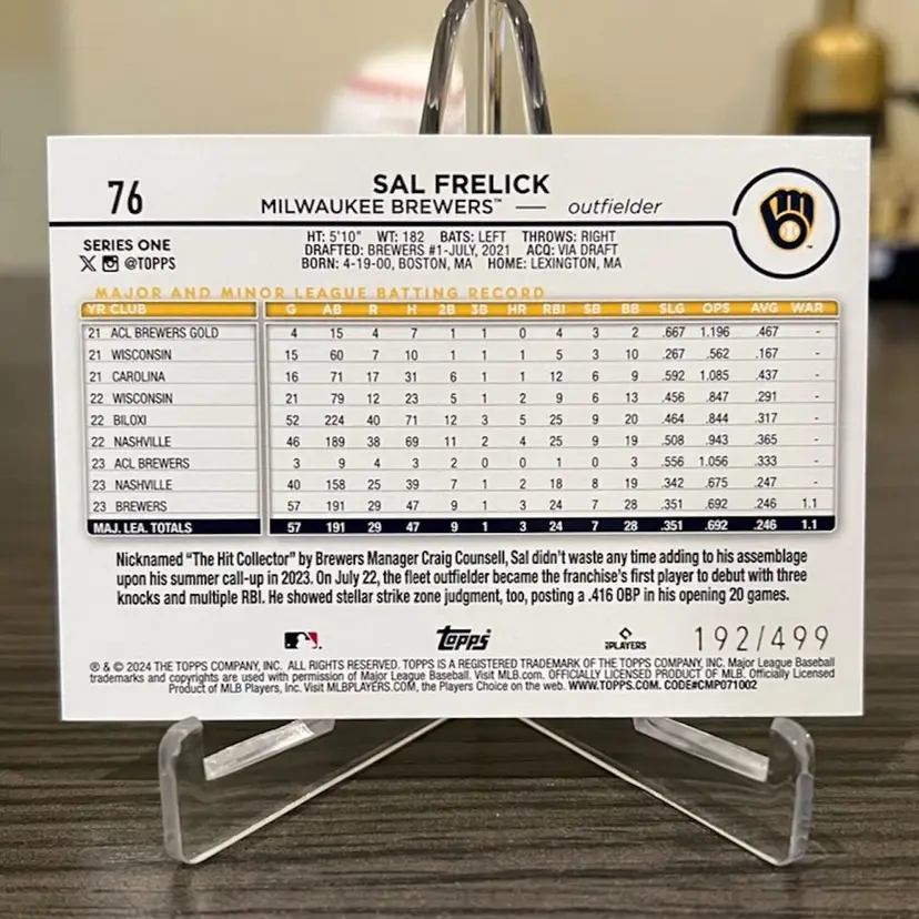 2024 Topps Series One Sal Frelick Rookie 192/499 Card No. 76 Milwaukee Brewers