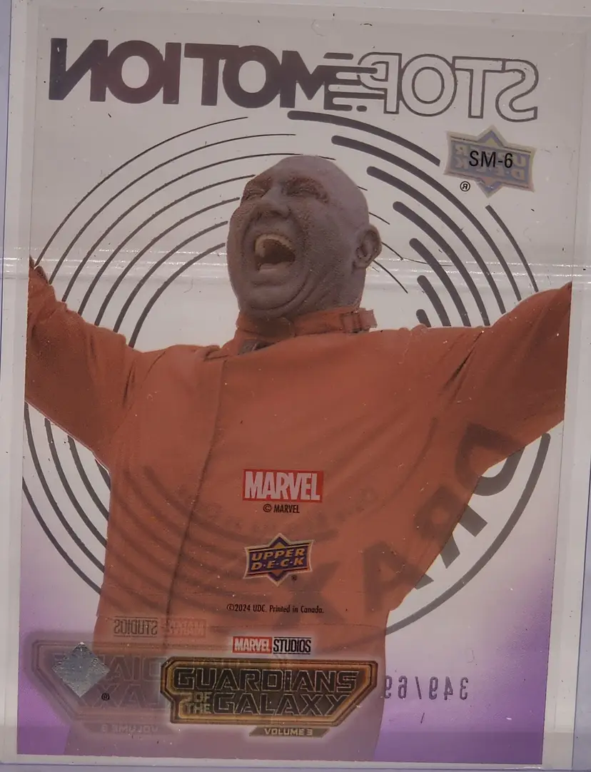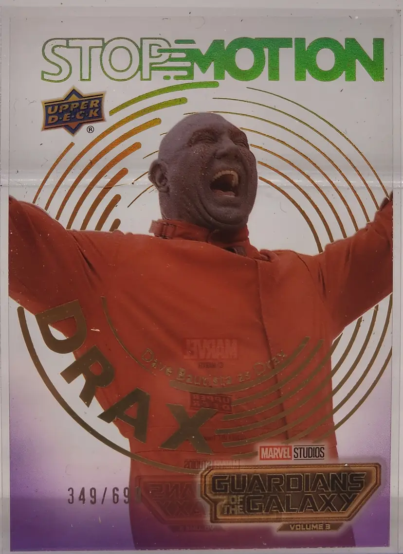 The product is a 2024 Upper Deck Guardians of the Galaxy Vol 3 Drax stop motion trading card numbered 349/699. This collectible features Drax, a character portrayed by actor Dave Bautista, in a unique insert design. Part of the Marvel set and franchise, this non-sport trading card is a must-have for fans of the Guardians of the Galaxy series.
