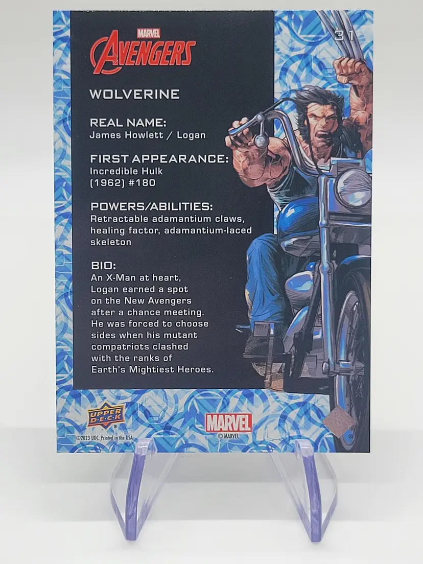 The 2024 Upper Deck Marvel Avengers Wolverine #31 Red Foil SP is a non-sport trading card featuring the character Wolverine from the Marvel franchise. Manufactured by Upper Deck in the United States, this original trading card is made of card stock with a thickness of 35 Pt. It is part of the Marvel Avengers set, with a standard card size and red foil parallel variety. The card is in English language and is suitable for collectors aged 16 and above who enjoy superhero, adventure, and comic genres.