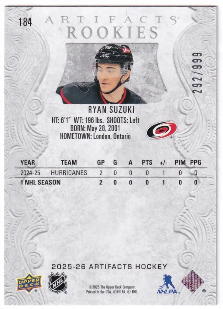2025-26 Artifacts #184 Ryan Suzuki RC Carolina Hurricanes Print Run - 999