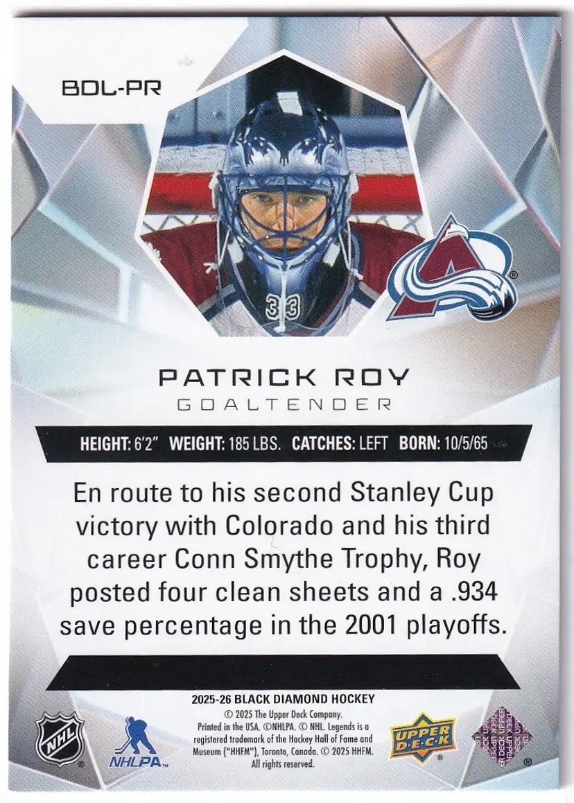2025-26 Black Diamond Diamond Legends #BDLPR Patrick Roy Colorado Avalanche Print Run - 249