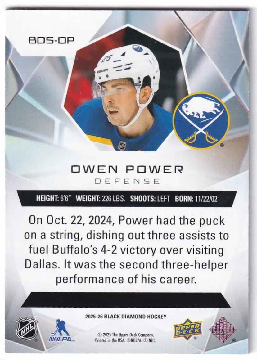 2025-26 Black Diamond Diamond Stars #BDSOP Owen Power Buffalo Sabres Print Run - 249