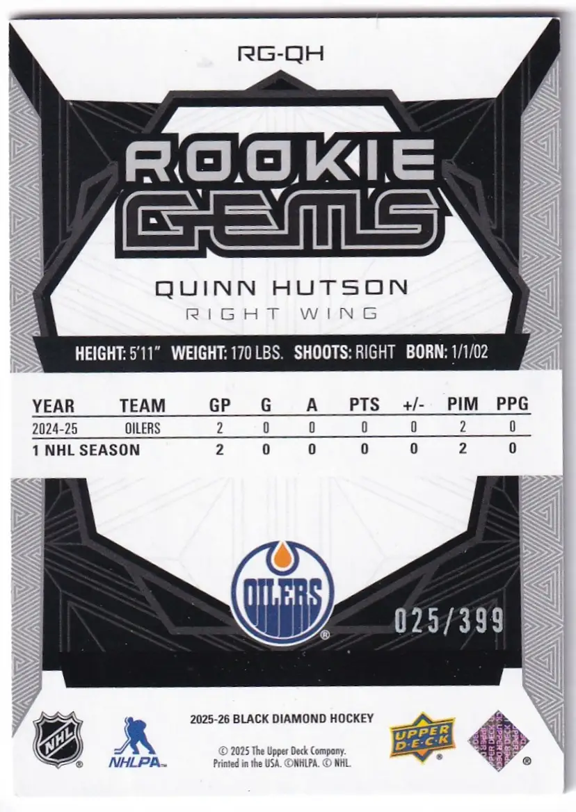 2025-26 Black Diamond Rookie Gems #RGQH Quinn Hutson Edmonton Oilers Print Run - 399