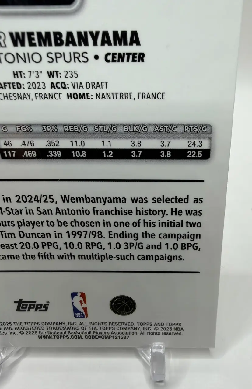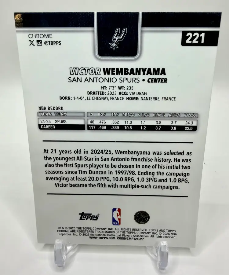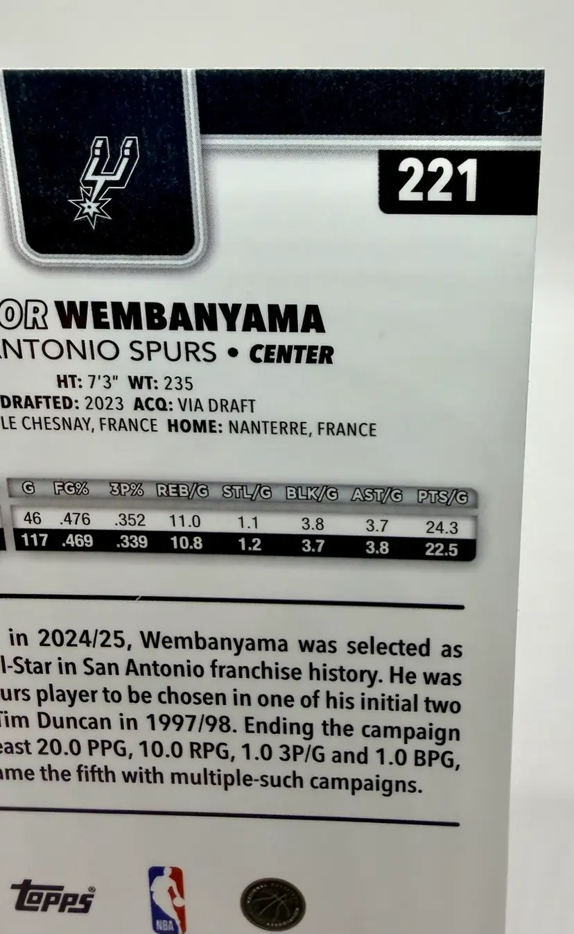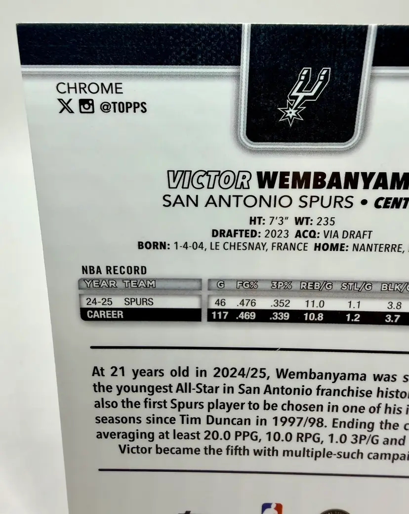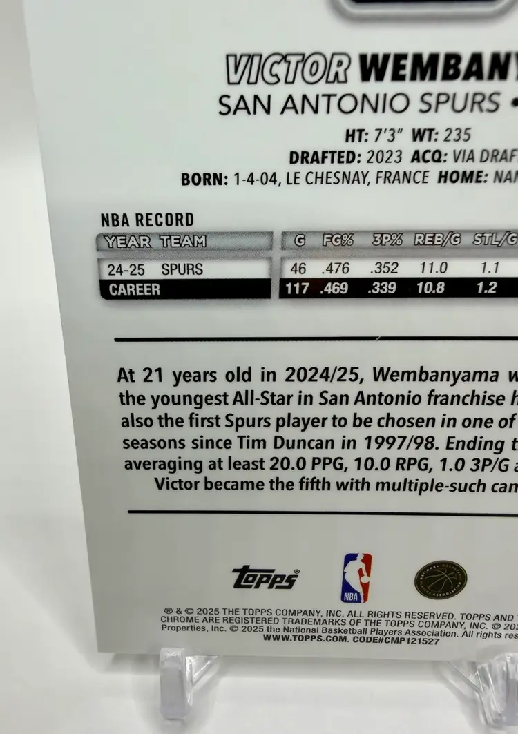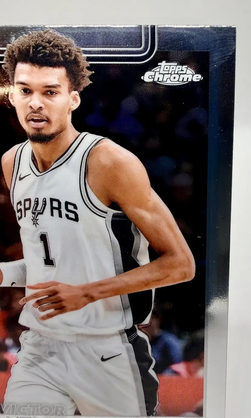 2025-26 Topps Chrome trading card featuring Victor Wembanyama of the San Antonio Spurs. This base set card is an original release by Topps and falls under the Sports Trading Card category. Please review the photos carefully to assess the condition of the cards. We do our best to provide clear, detailed images, especially for cards with noticeable flaws. Please note that some raw cards may show light wear, so we encourage close inspection. Cards will be shipped securely. Thank you for checking out our store and for your support!SKU: 101 cc cl