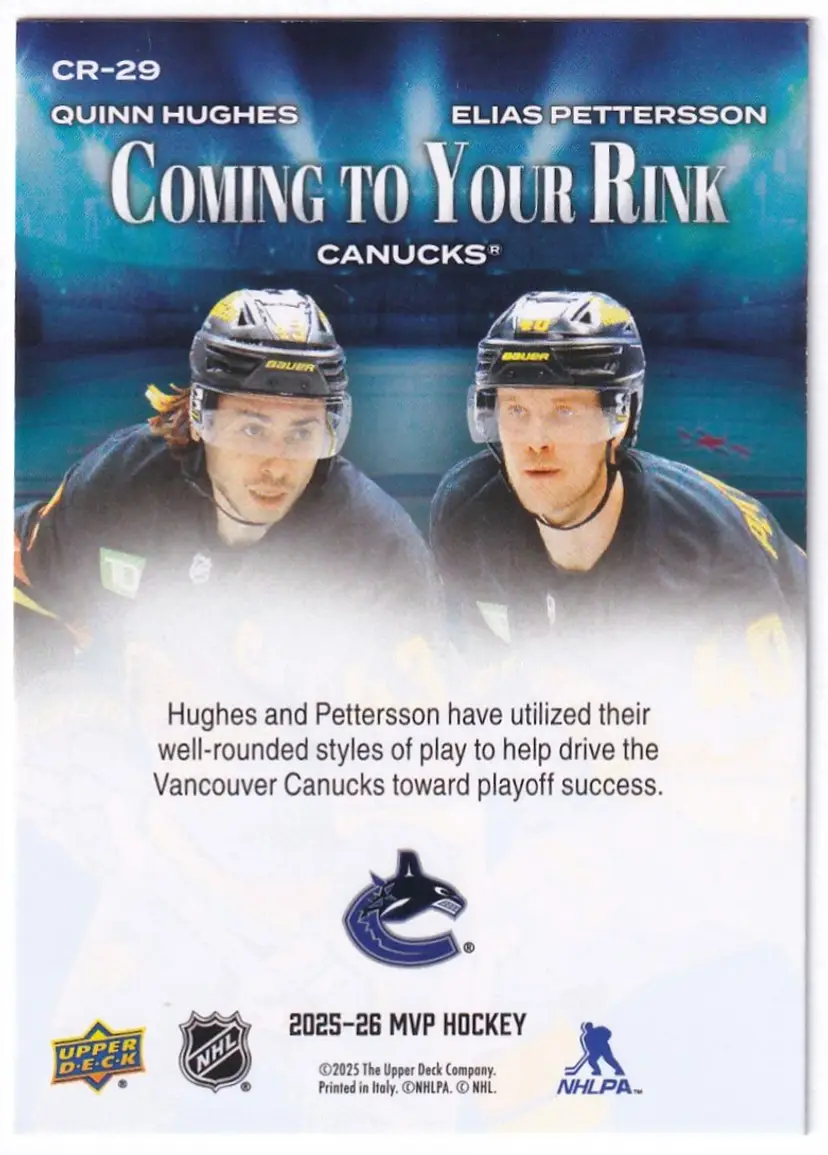2025-26 Upper Deck MVP Coming to Your Rink #CR29 Quinn Hughes / Elias Pettersson Vancouver Canucks