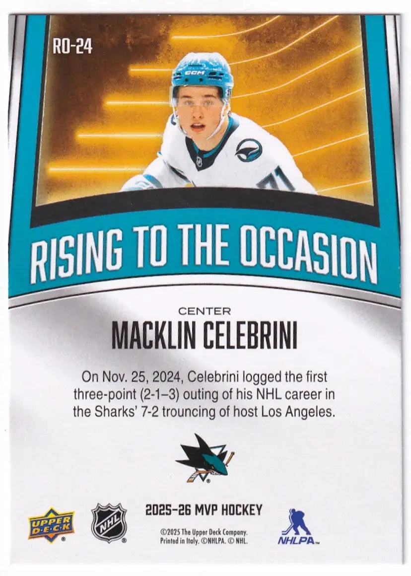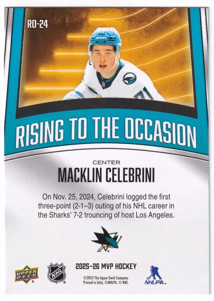 2025-26 Upper Deck MVP Rising to the Occasion #RO24 Macklin Celebrini San Jose Sharks