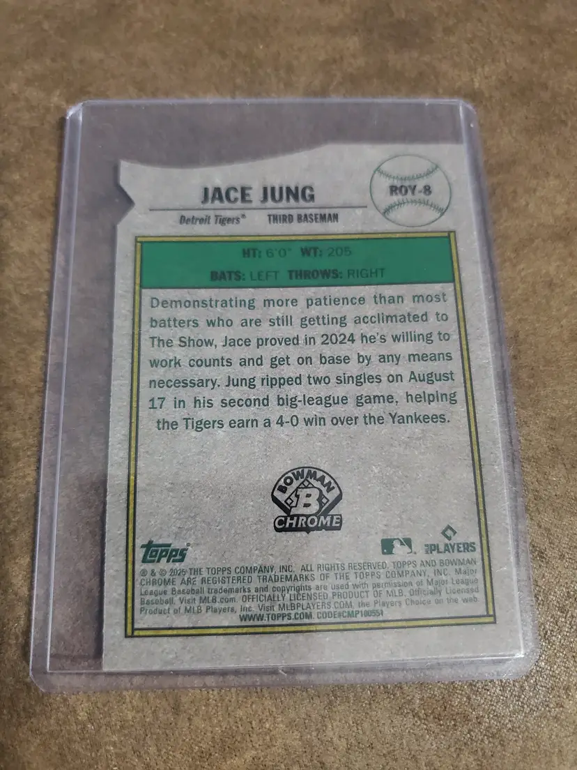 Snag this Bowman Chrome Rookie of the Year card featuring Jace Jung. A perfect addition for baseball card collectors!