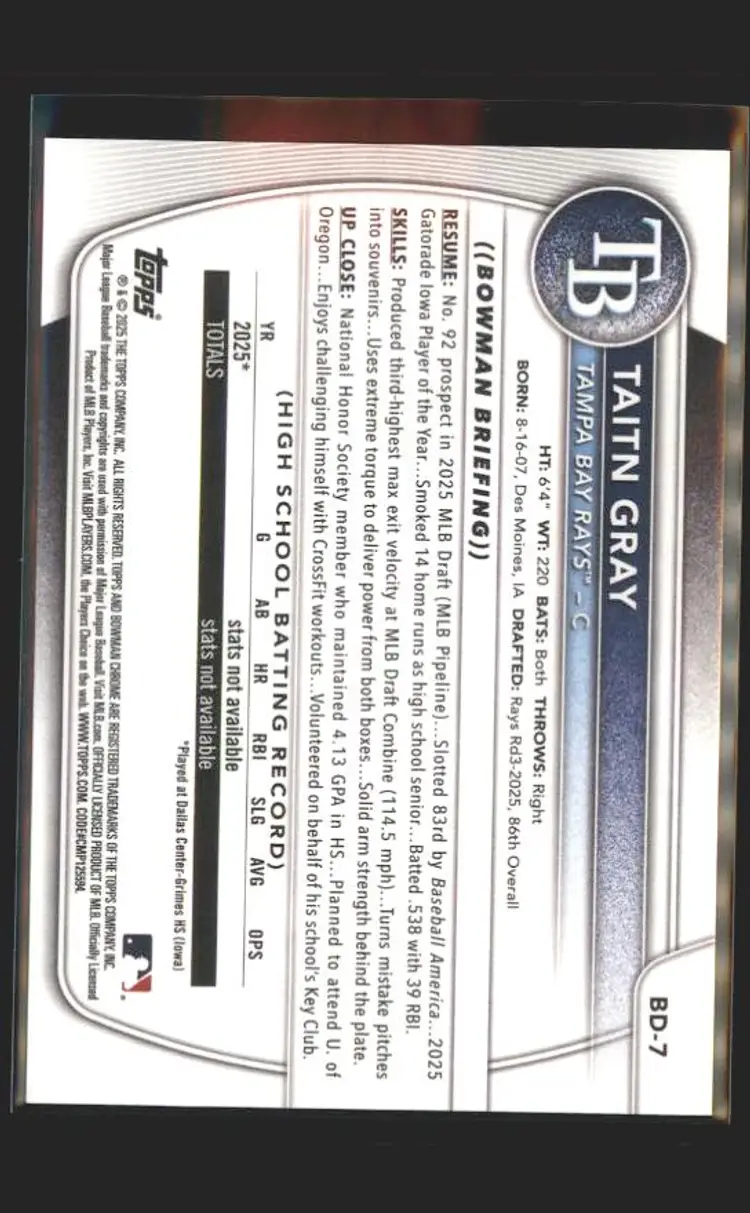 2025 Bowman Draft #BD-7 Taitn Gray - (137) - Tampa Bay Rays