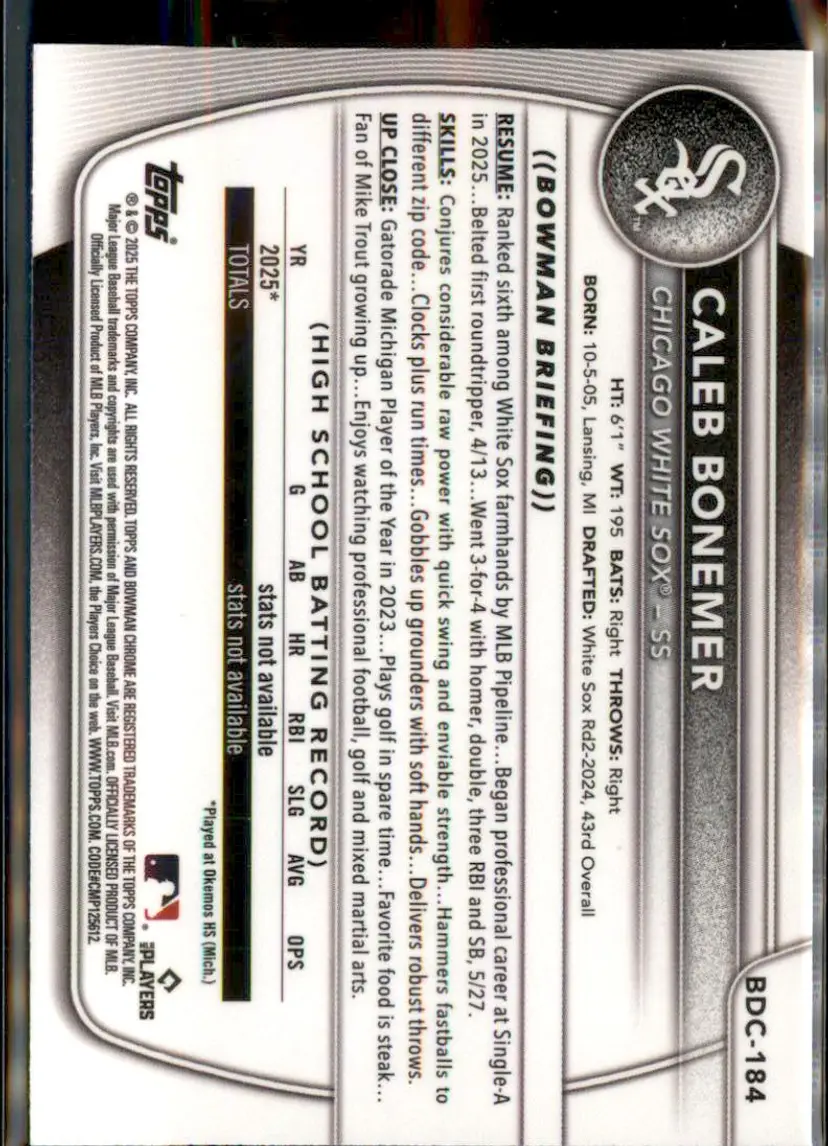 2025 Bowman Draft #BDC-184 Caleb Bonemer Chrome - (138) - Chicago White Sox