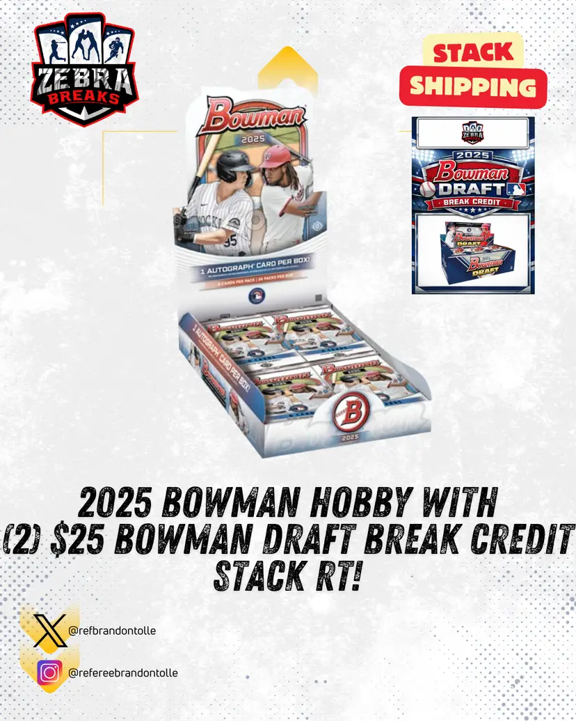 2025 Bowman Hobby (2) $25 Bowman Draft Break Credit to be given away by Electronic Selection! STACK SHIPPING APPLIES All cards stack, you can request shipping by purchasing the "Stack Shipping Request" Item in the marketplace for Zebra Breaks specifically. Stack shipping is a $6 flat fee no matter how large your stack is. Shipping will occur the Sunday/Monday following your request if placed by Thursday night of the week you request shipping.