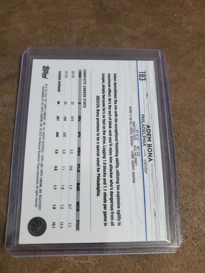 Snag this Topps Chrome rookie card featuring Adem Bona in his Philadelphia gear. A great addition for basketball card collectors!
