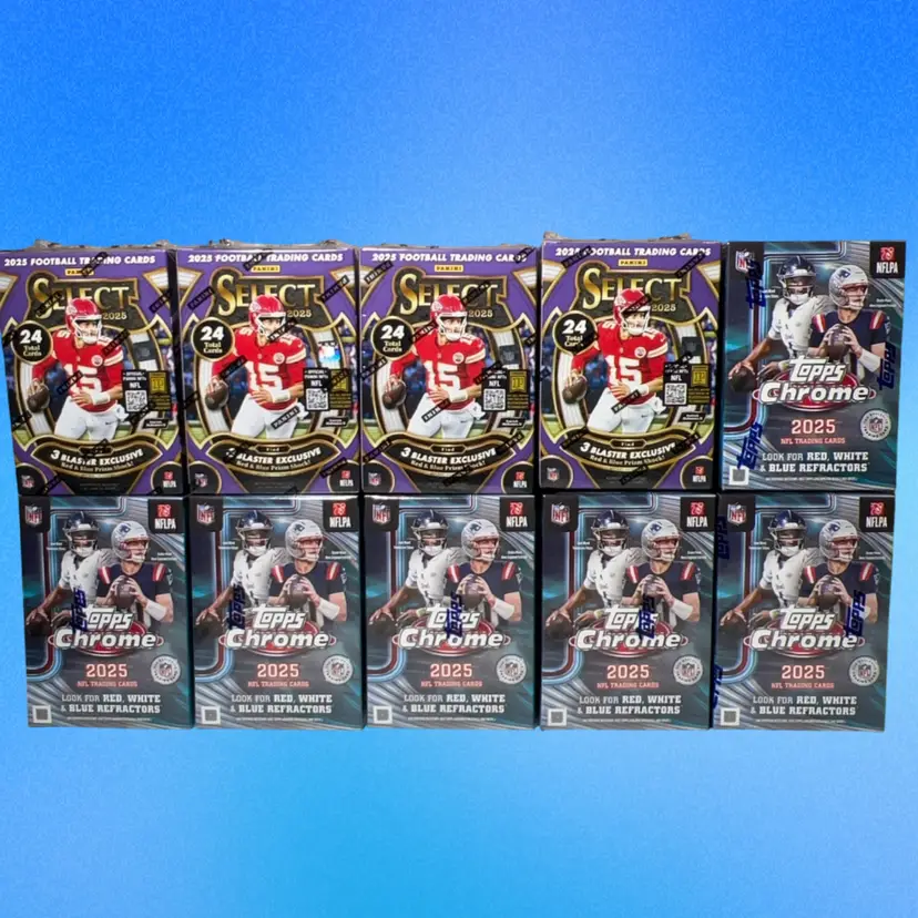 6 Topps Chrome/ 4 Panini Select Football You are purchasing 1 unknown team, assigned to you via live verified draw minutes before we open the boxes. You’ll have that same team in all the boxes. This is a stacked shipping item and will not ship until the “shipping request” is purchased for $6 or you have an item purchased that includes free shipping to combine it with. There is no deadline to purchase shipping and your stack is saved indefinitely.