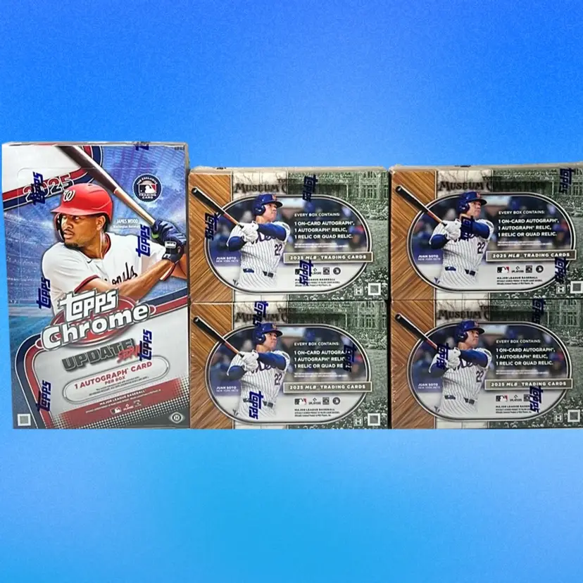 This team in a 5 box live rip. 4 boxes of 2025 Topps Museum and 1 Hobby box of 2025 Topps Chrome Update. All cards ship. Rips 2/6. This is a stacked shipping item and will not ship until the “shipping request” is purchased for $6 or you have an item purchased that includes free shipping to combine it with. There is no deadline to purchase shipping and your stack is saved indefinitely.