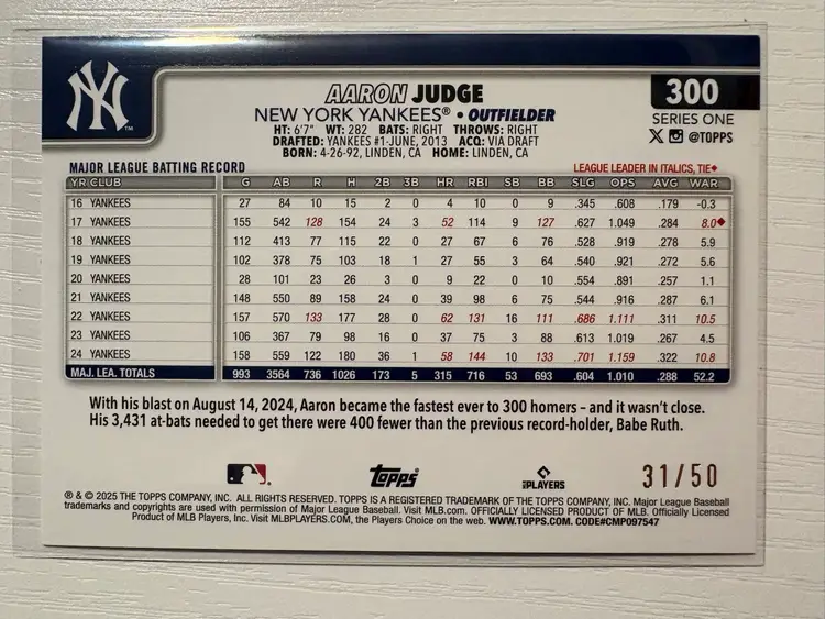 2025 Topps Series 1 SSP Aaron Judge Gold Foil Spring Training Variation Numbered 31/50