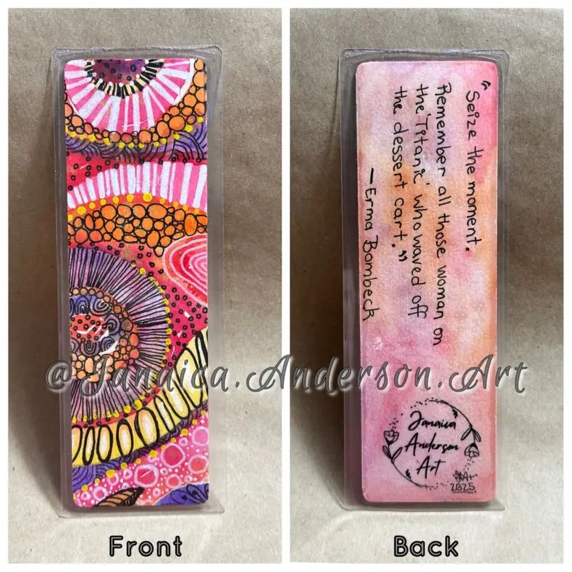 • Abstract bookmark hand painted on both sides. • Original acrylic, or watercolor & mixed media artwork. • Sealed and protected with (2) layers of archival varnish then laminated for long-term enjoyment! • Size is 2.25” wide by 6.25” tall.