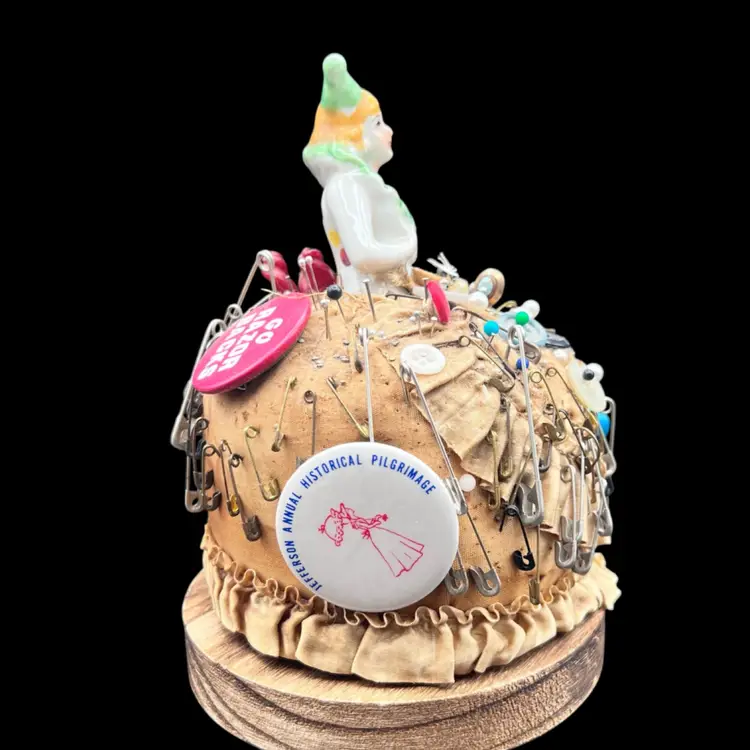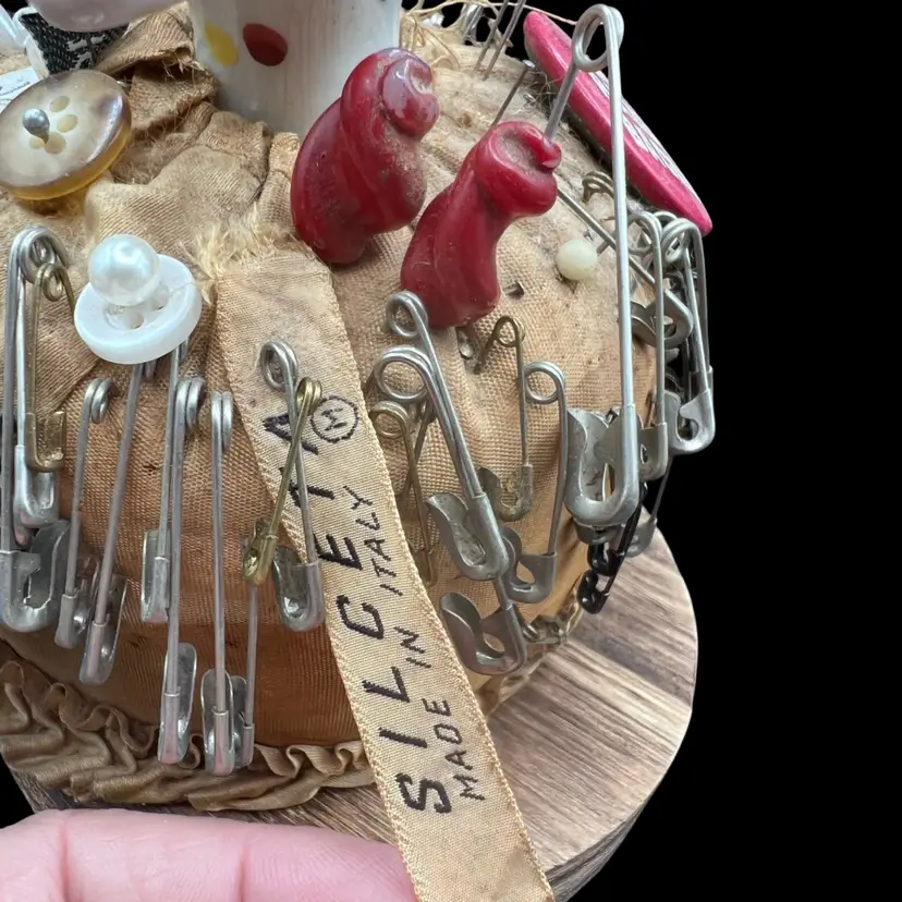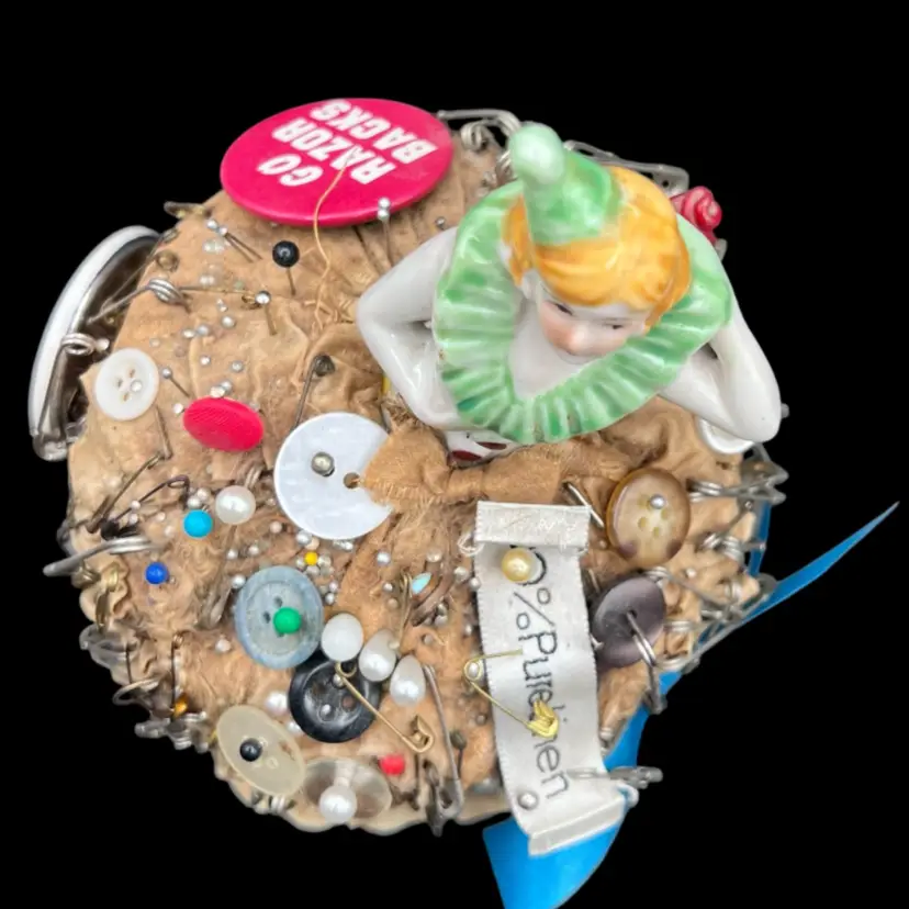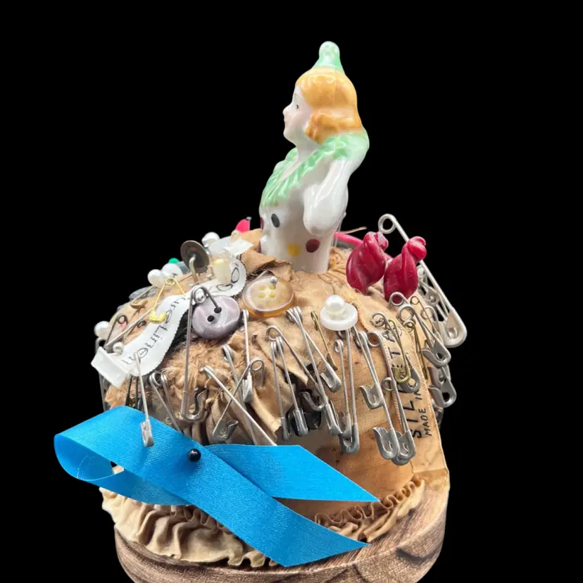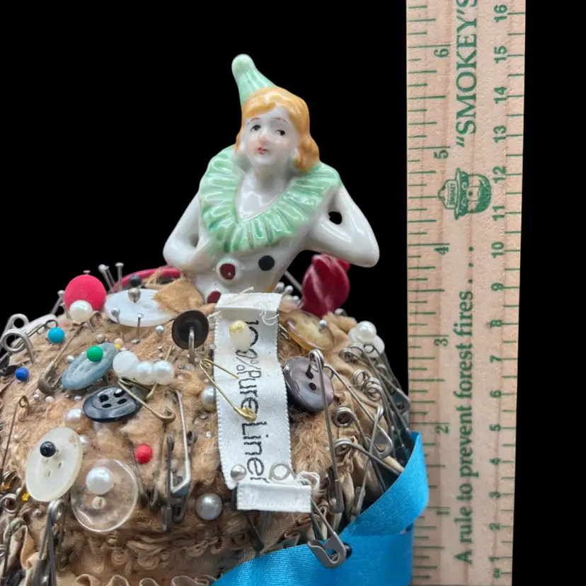 Vintage Porcelain Half Doll Pin Cushion Pirouette Clown Costume and a Fancy Victorian Hoop Skirt Full of Many Pins, Buttons, Hat Pins and Even Some Old Garment Tags From Past Project’s In well used vintage condition. The dress is very faded and a little tilted but full of charm and whimsy 6” tall x 4 3/4” in diameter