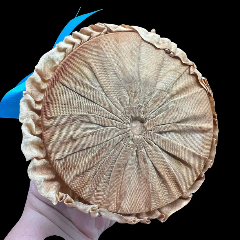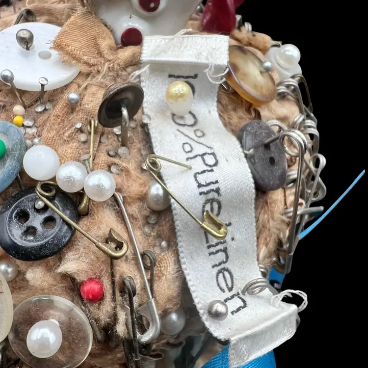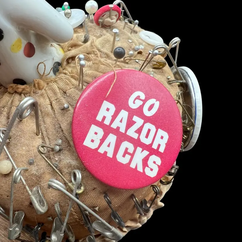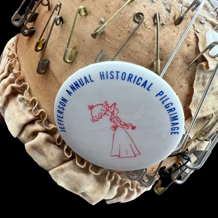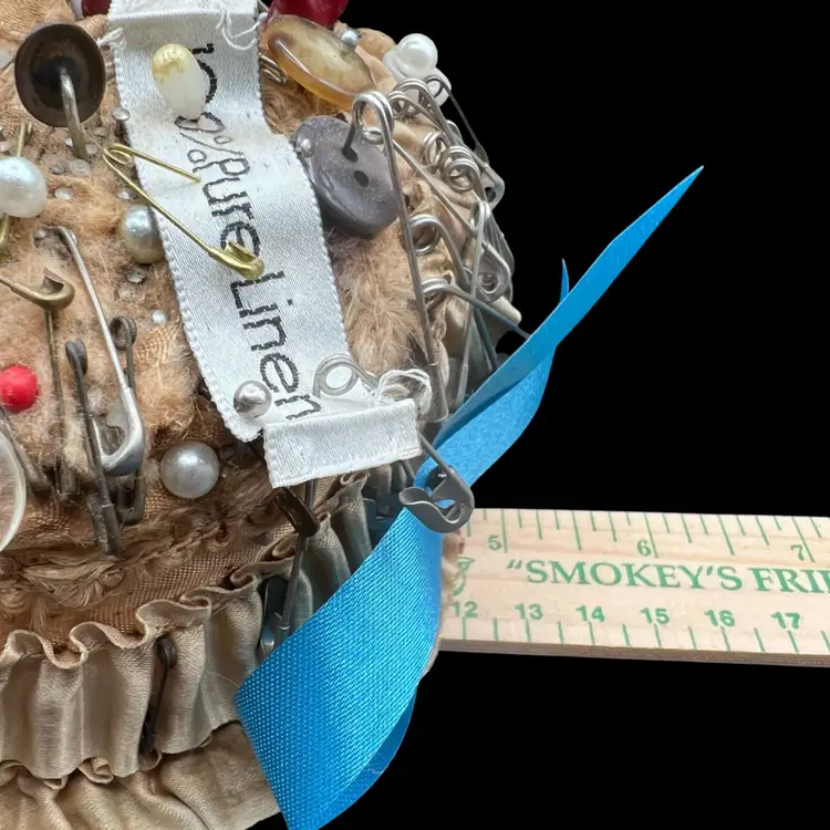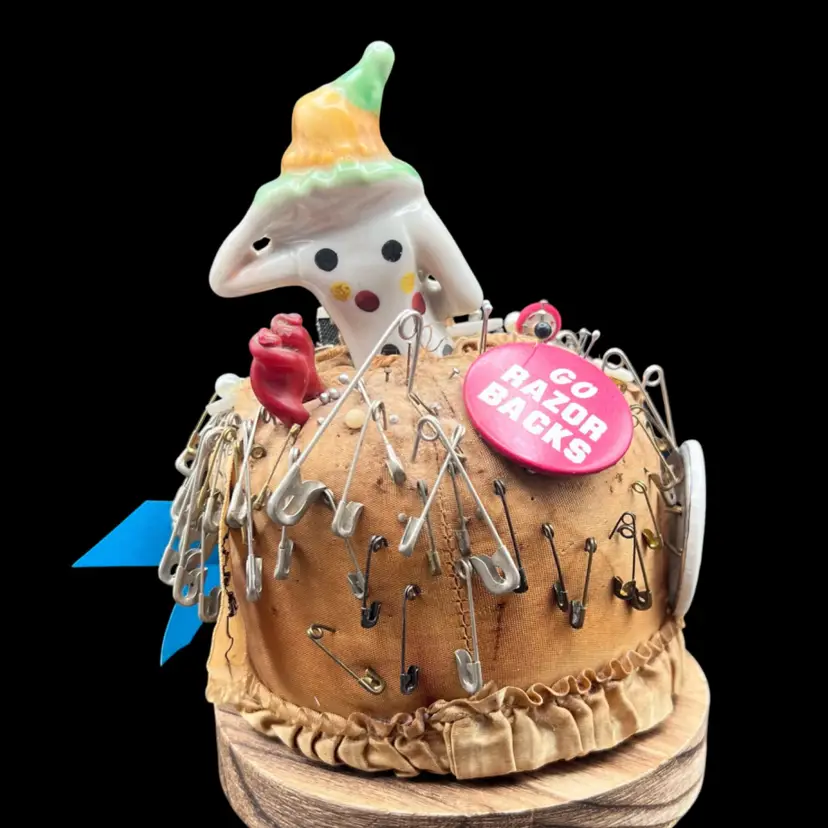 Vintage Porcelain Half Doll Pin Cushion Pirouette Clown Costume and a Fancy Victorian Hoop Skirt Full of Many Pins, Buttons, Hat Pins and Even Some Old Garment Tags From Past Project’s In well used vintage condition. The dress is very faded and a little tilted but full of charm and whimsy 6” tall x 4 3/4” in diameter