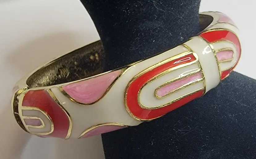 Signed, hinged enamel bangle bracelet. I have had no luck attributing the signature to a designer. Goldtone with red, pink and white enameling. In excellent condition. The opening measures 2 ¼” and the bracelet is ½” wide. One of my favorite pieces!