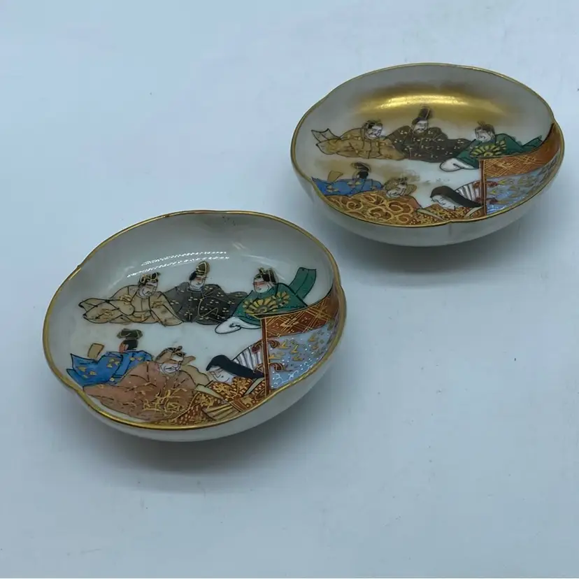 These small dishes, likely used as sake cups or decorative saucers, showcase the fine craftsmanship characteristic of Japanese porcelain during this period. The detailed depiction of figures in traditional dress, combined with the gilded rims and rich color palette, reflects the aesthetic sensibilities and artistic techniques prevalent in late 19th-century Japanese decorative arts.