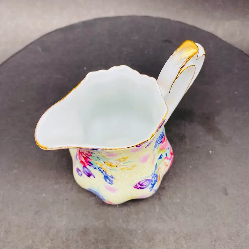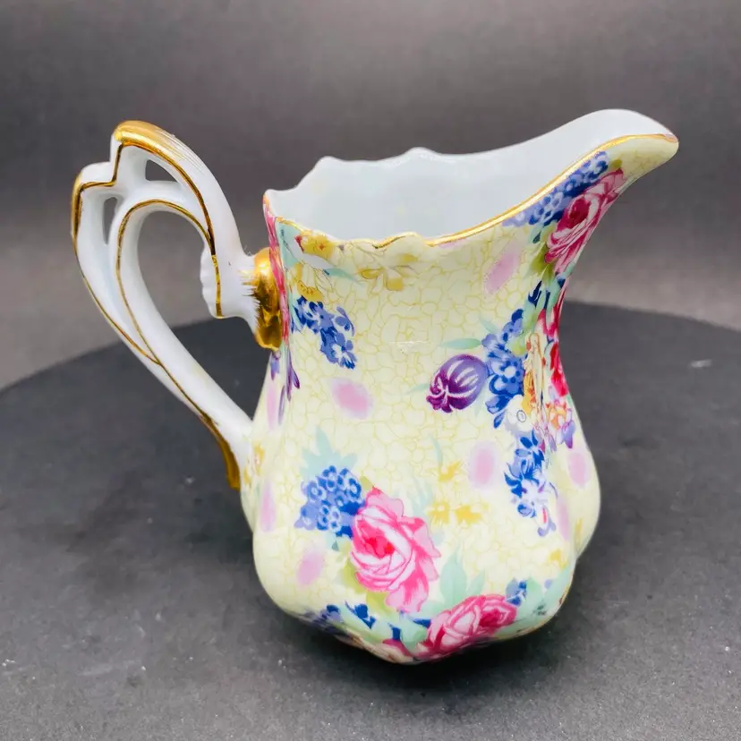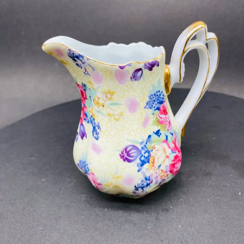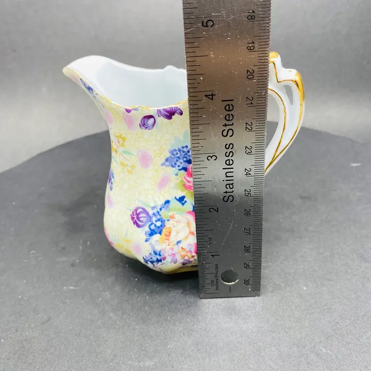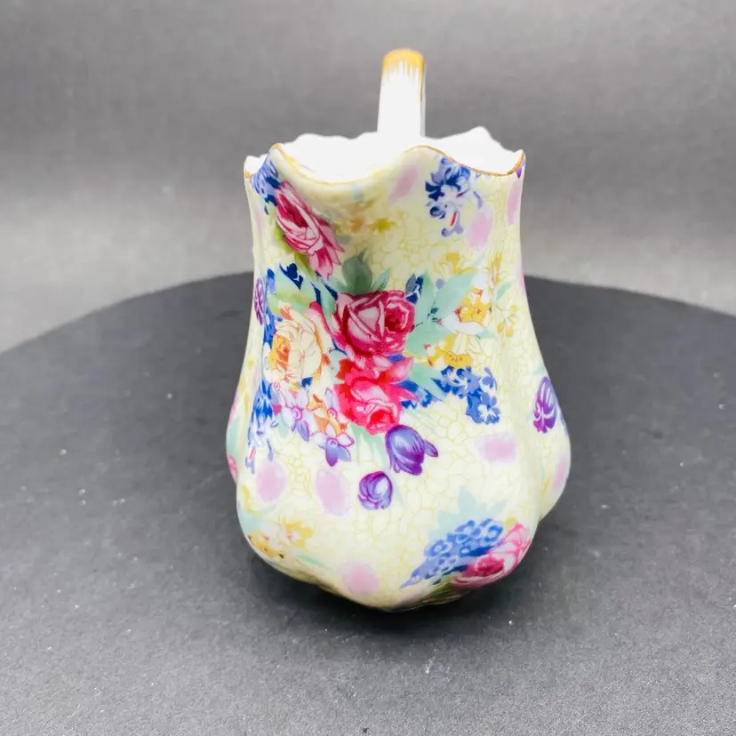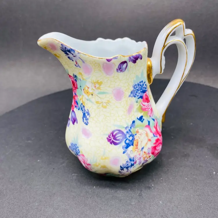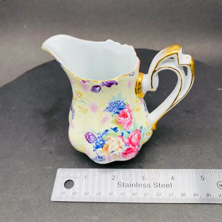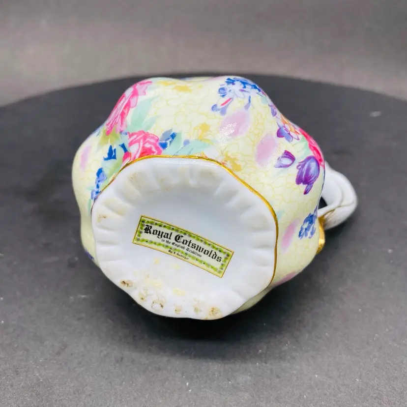 Vintage Royal Cotswold Chintz Floral jug creamer with Gold Highlights. This elegant creamer features a charming floral pattern and is made by renowned brand Godinger. Perfect for serving cream or milk at your next tea party or to add a touch of vintage charm to your table setting. The creamer is a delightful addition to any collection of decorative cookware and dinnerware, reflecting a production style reminiscent of classic chintz designs. Add a touch of sophistication to your dining experience with this beautiful piece.