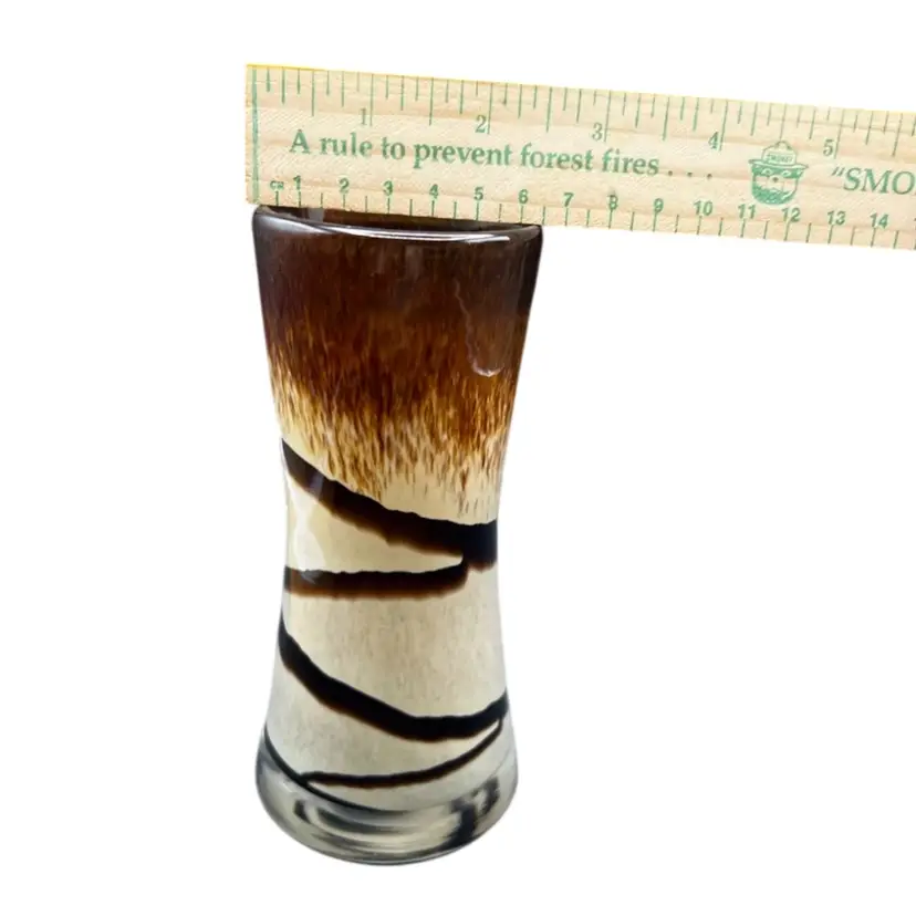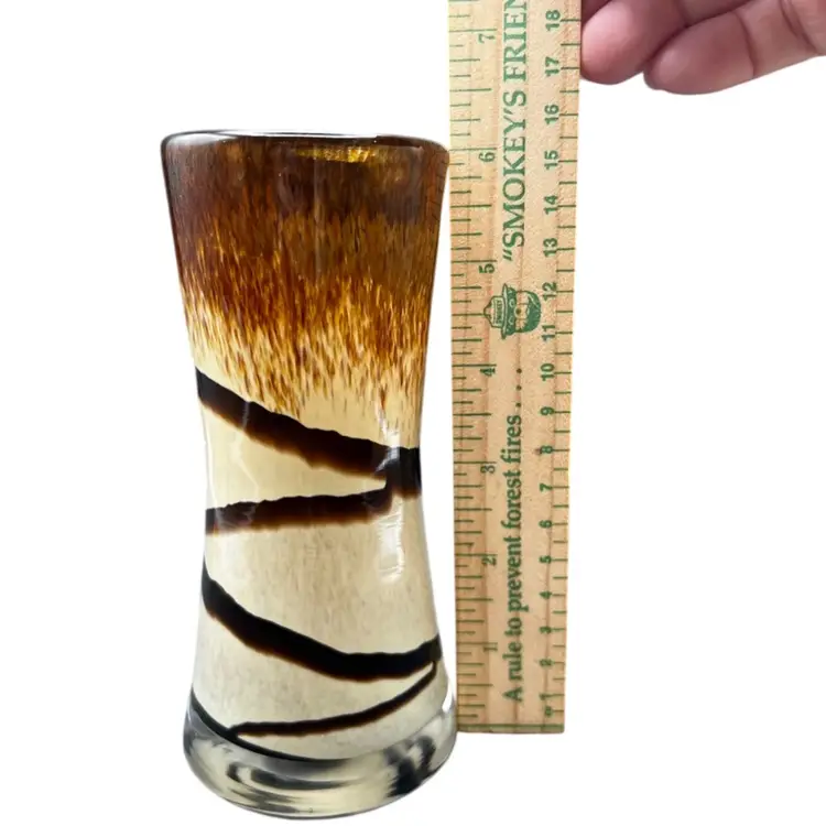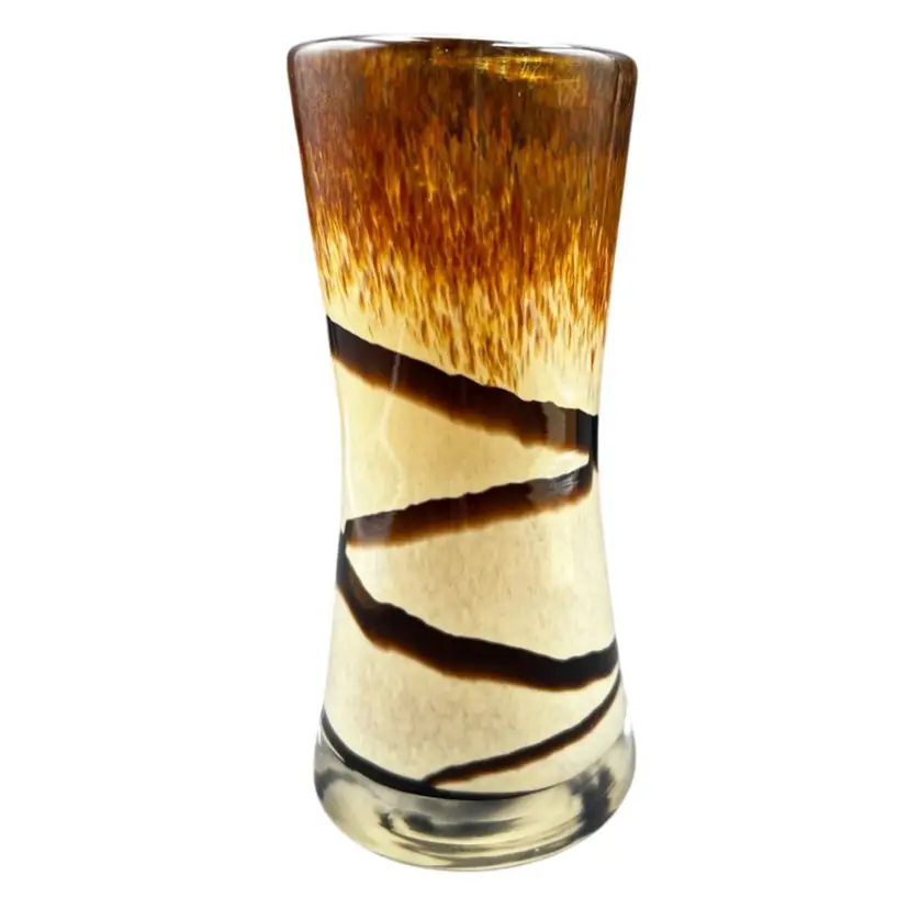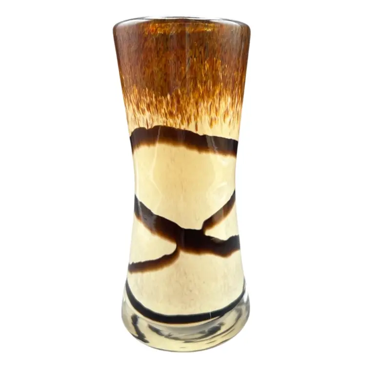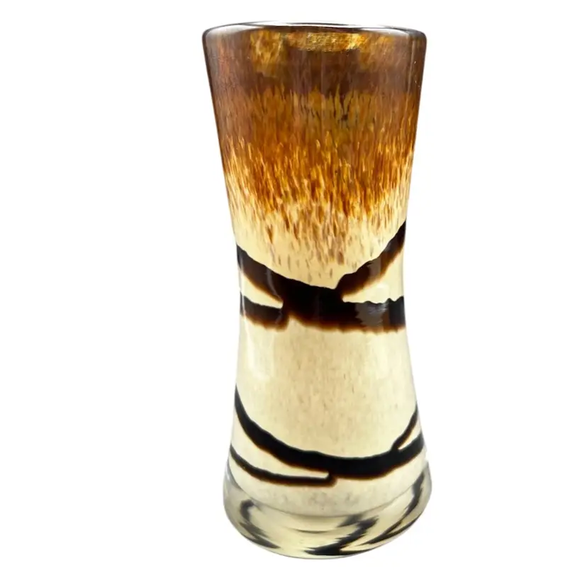 Vintage Art Glass Vase. Browns And Tan With Abstract Swirl Design In excellent condition 6” tall x 2 3/4” at base x 2 1/2” at rim.