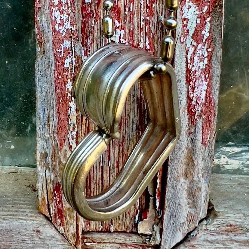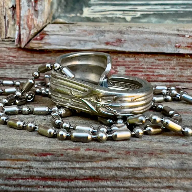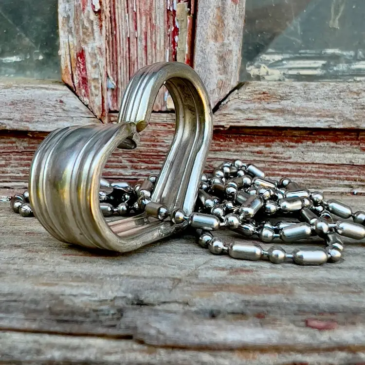 This is a spoon handle that’s been shaped into a heart and hung on a 30” beaded chain. The chain can be cut with scissors if you want it shorter. This one measures approx. 1.25” x .75” I will be offering these stamped with a name etc.