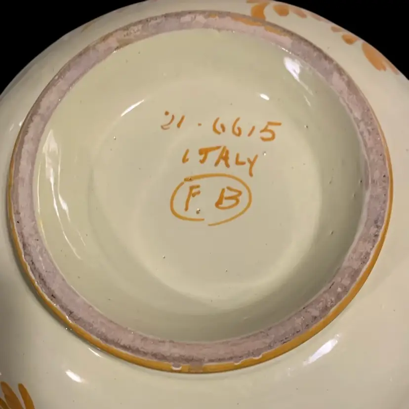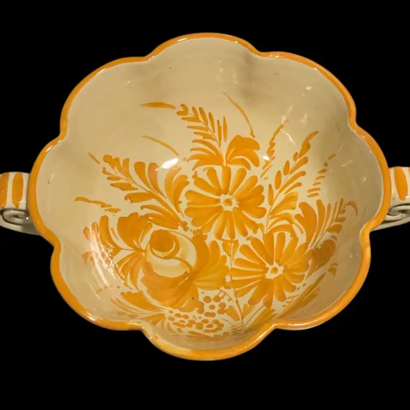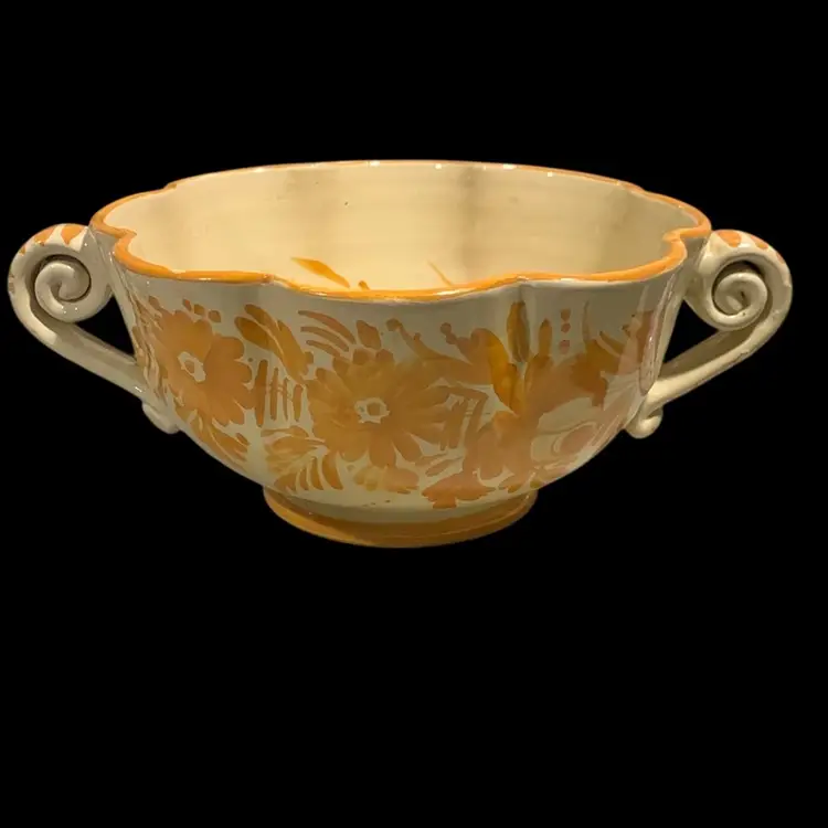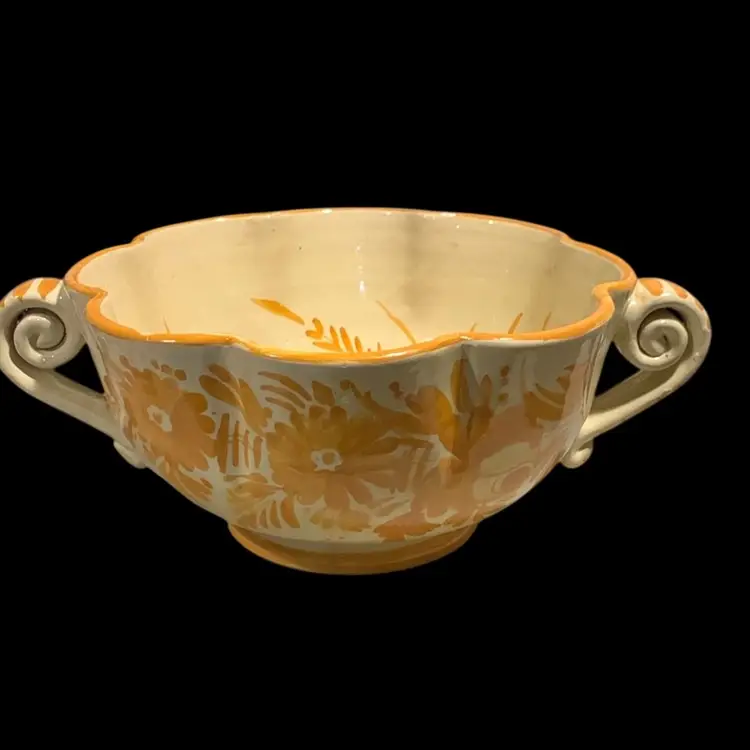 22. Vintage yellow handmade hand painted Italian pottery bowl 4 inches high by 8 inches in diameter.