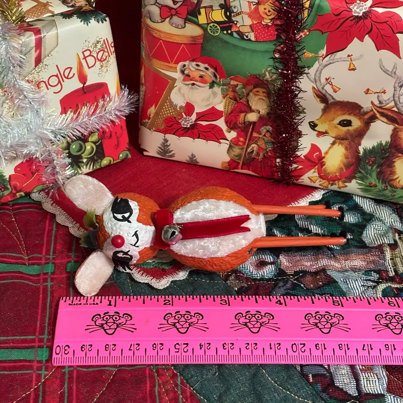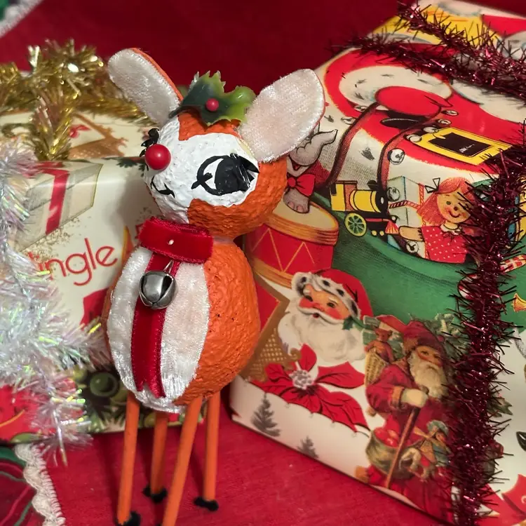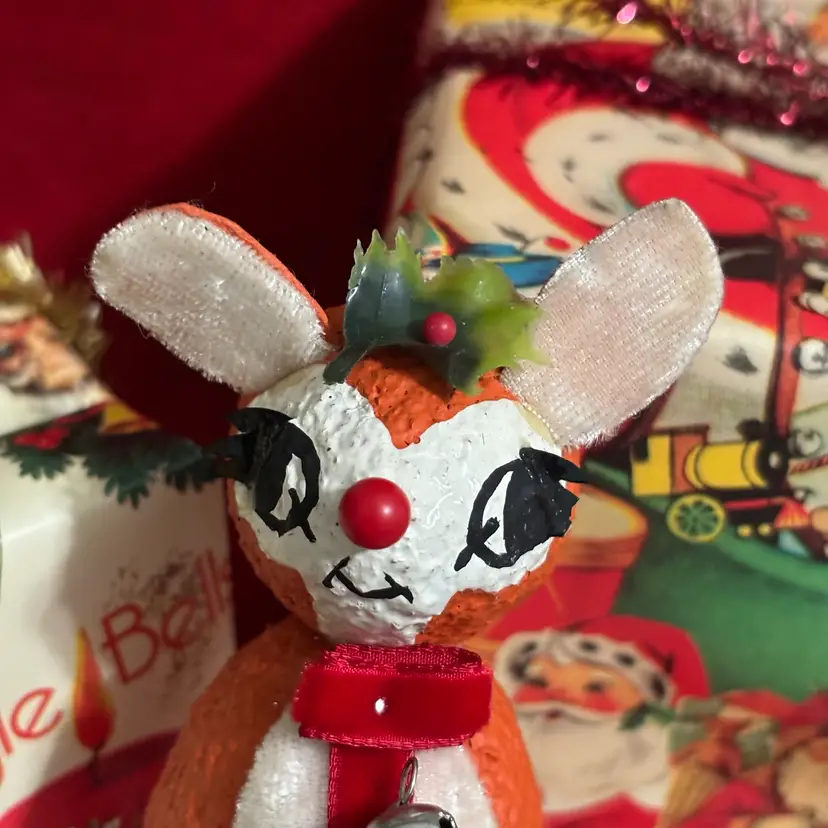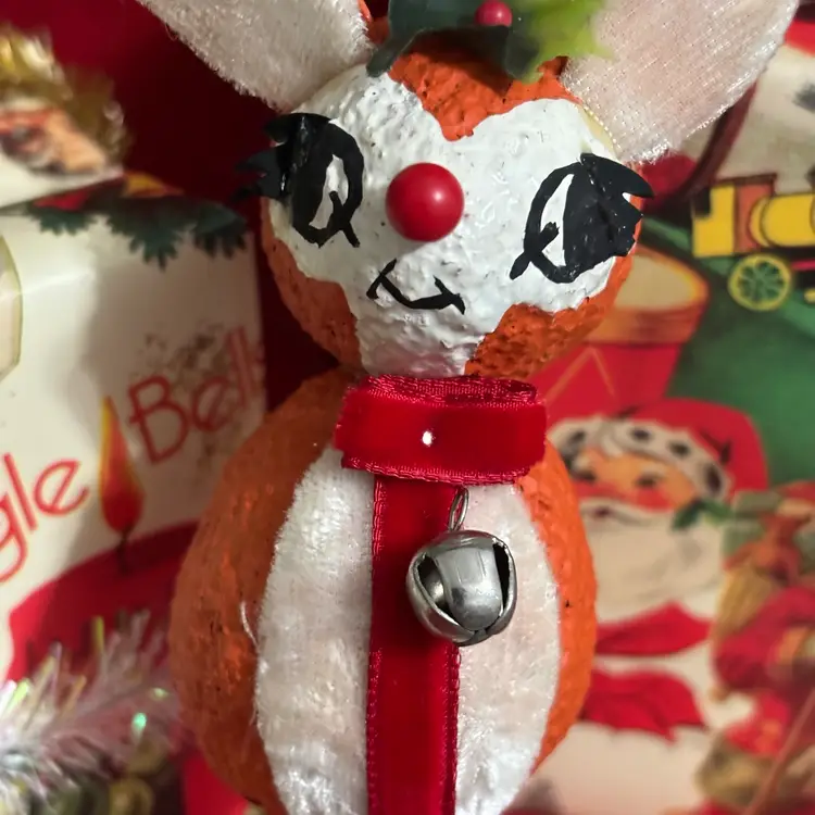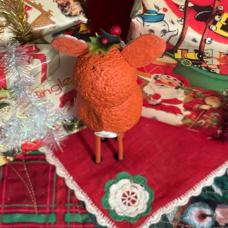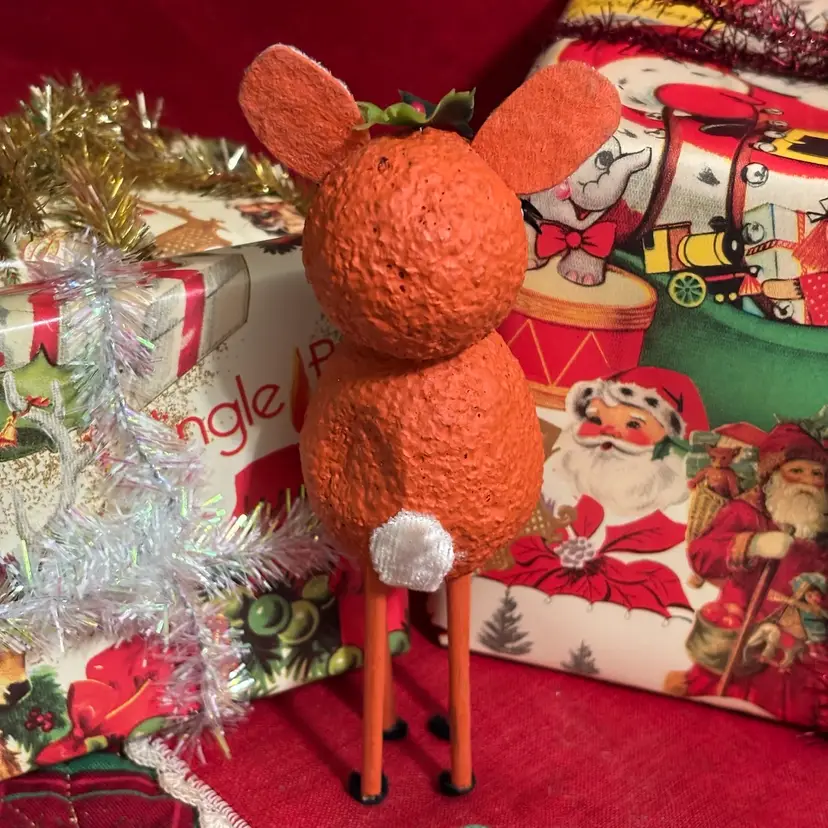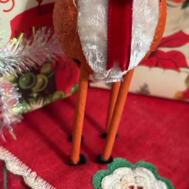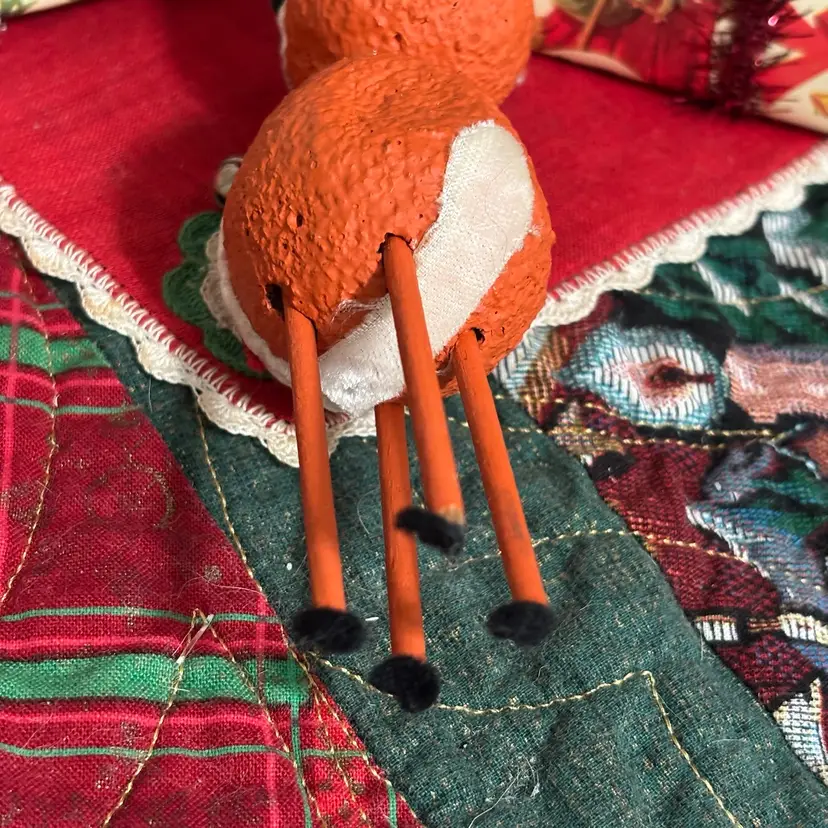 This little guy is created with what appears to be paper mache and a rough paint job. Has a painted face. He does have some issues that make him a misfit. Has a dent on his side and gaps where his legs attach to body. But he still needs a home and love.