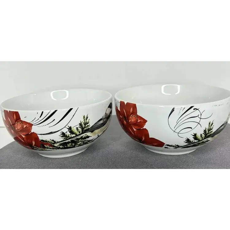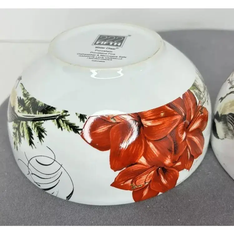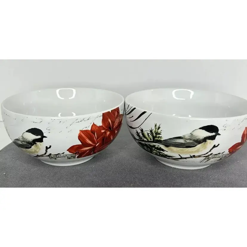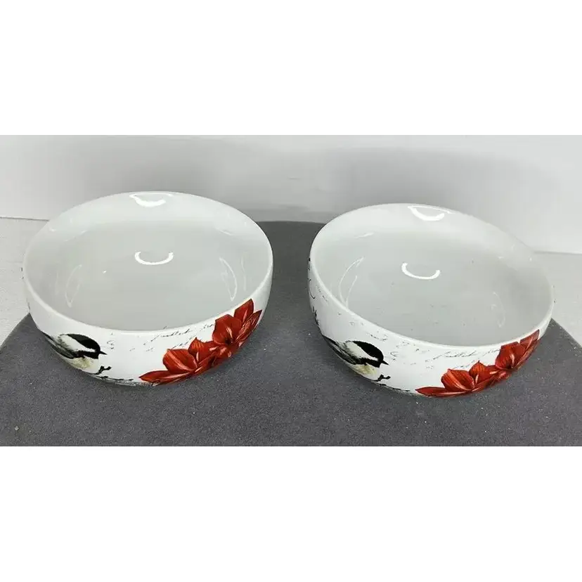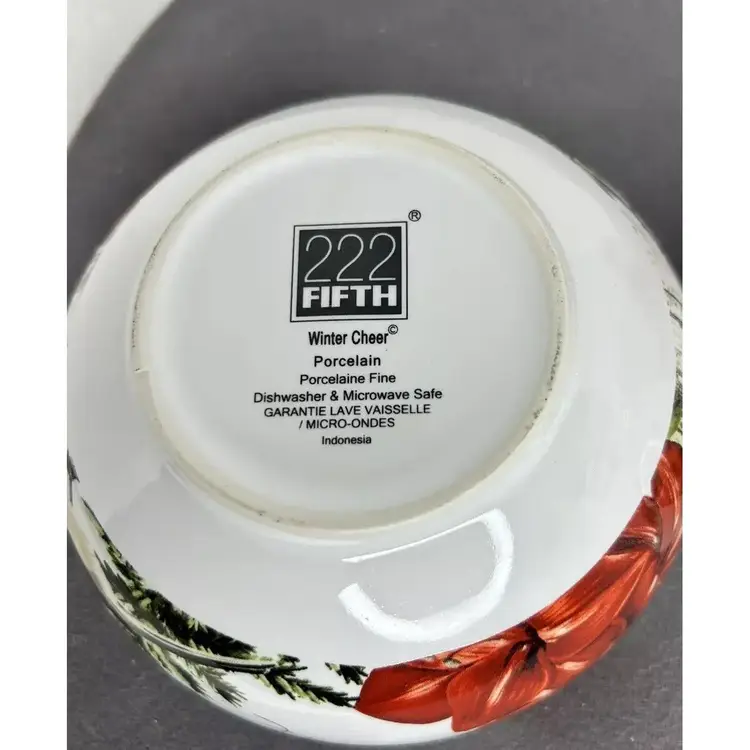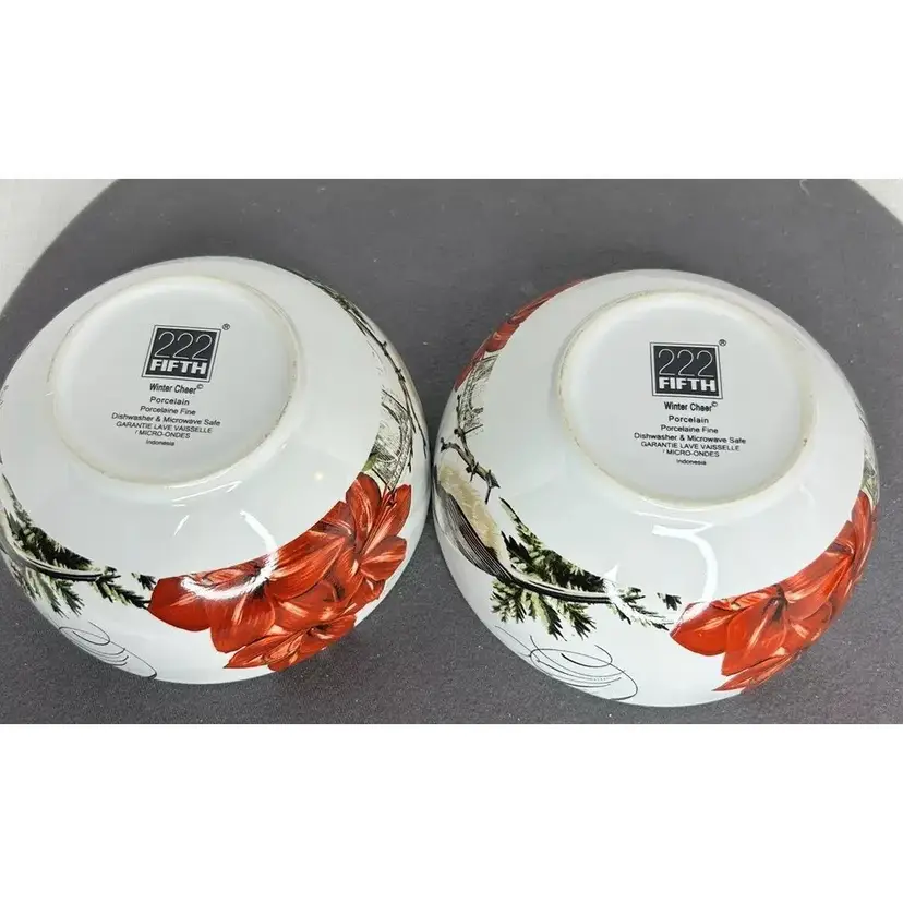 Winter Cheer Bird Christmas Porcelain Soup/Cereal 2 Bowls, by 222 Fifth • Width: 5.5" in • Height: 2.75" in • Crafted In Indonesia • Microwave Safe, Dishwasher Safe • Discontinued Pieces Winter Cheer Bird Christmas Porcelain Soup/Cereal 2 Bowls, By 222 Fifth are in excellent pre-owned condition, with NO chips, cracks or repairs. Please review all pictures for proper assessment of its excellent pre-owned condition.