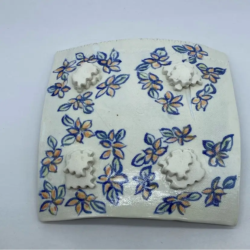 7 x 7 inch No chips or cracks This piece appears to be a contemporary example of studio pottery, likely created within the last few decades. The sunflower design and textured edges suggest a focus on decorative appeal, aligning with the studio pottery tradition of blending art and functionality.
