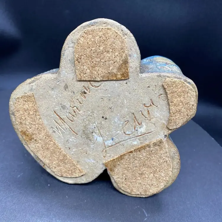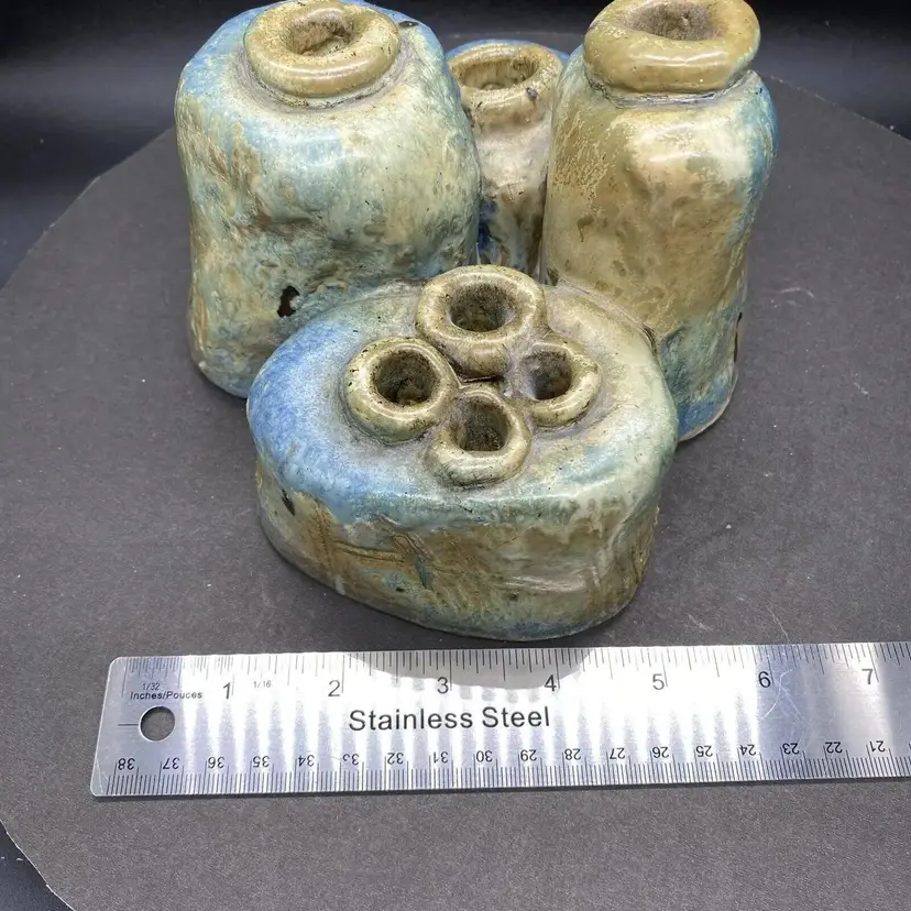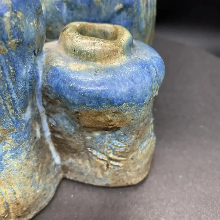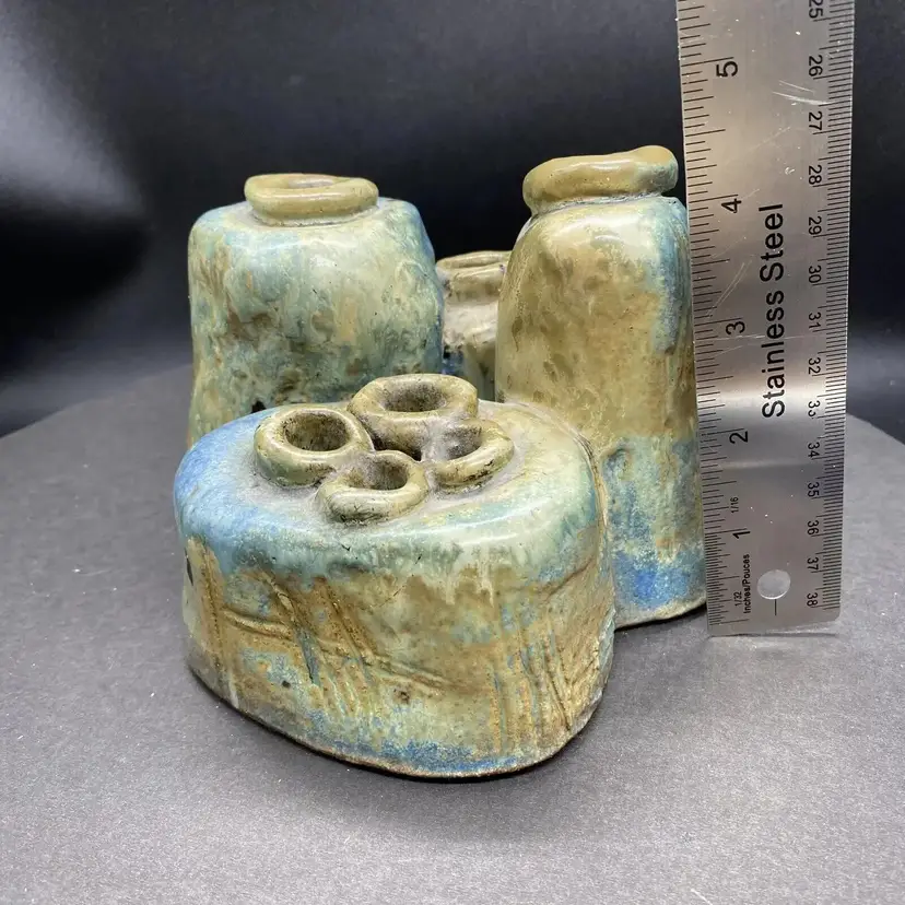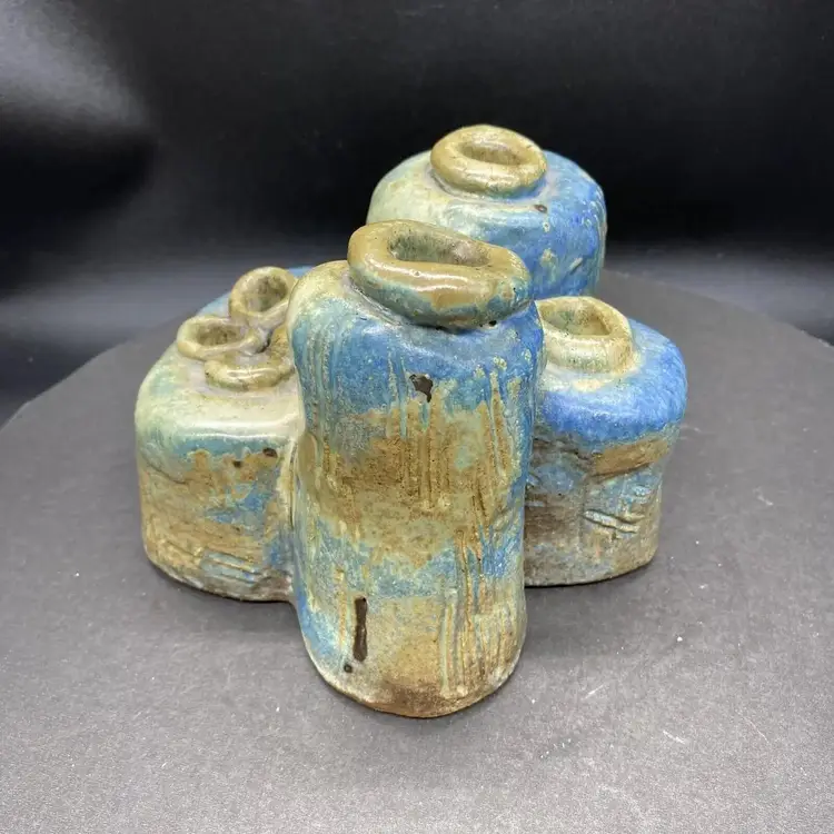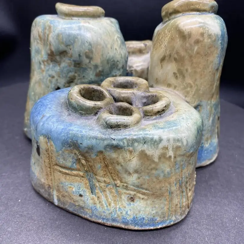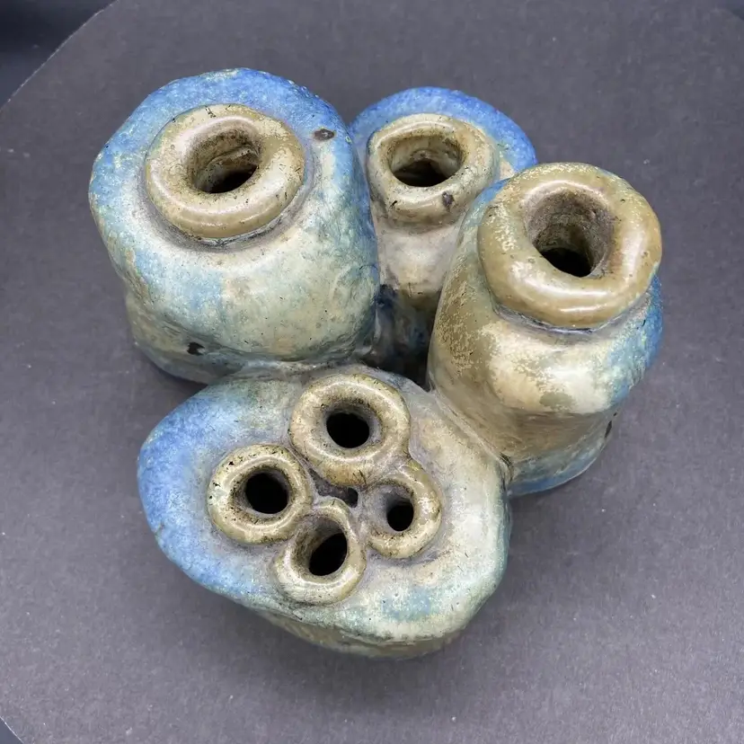 This vintage set of four joined bud vases is a beautiful addition to any home decor. Each vase is handcrafted with care and the whole is one unique heavy art pottery piece signed by the artistThe multicolor glaze adds a touch of blue green elegance to any room, and the abstract art subject is sure to impress. These vases are perfect for displaying flowers or as standalone decorative pieces. Their production style and technique are a testament to the skill and creativity of the artist. Whether you're a collector of art pottery or simply looking for a stunning piece to add to your home, this set is sure to impress.