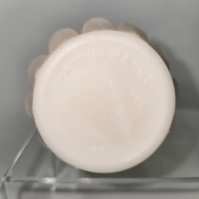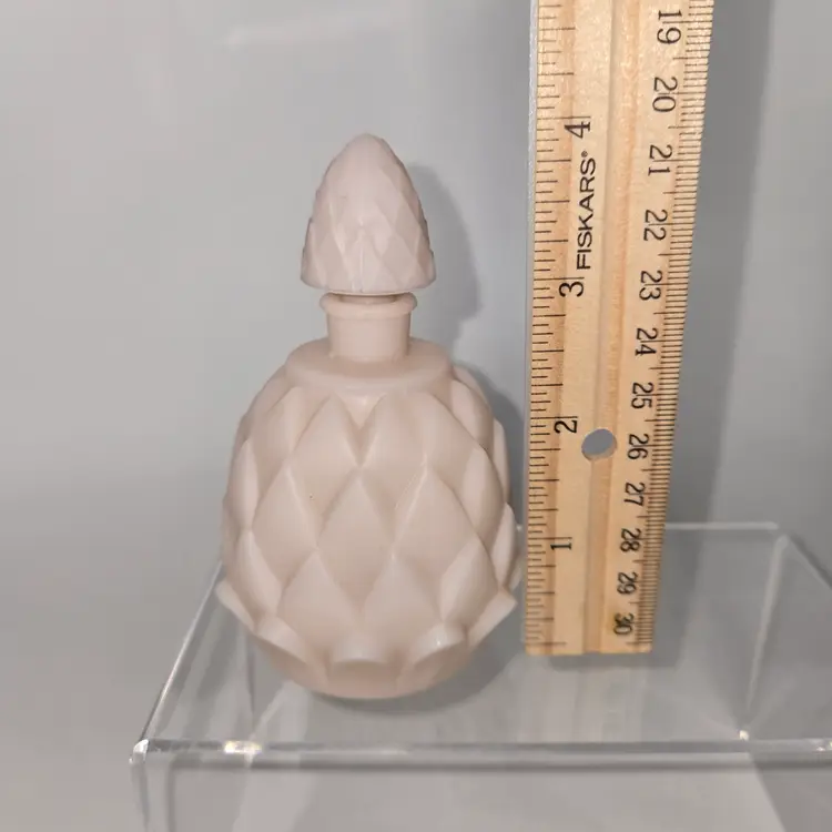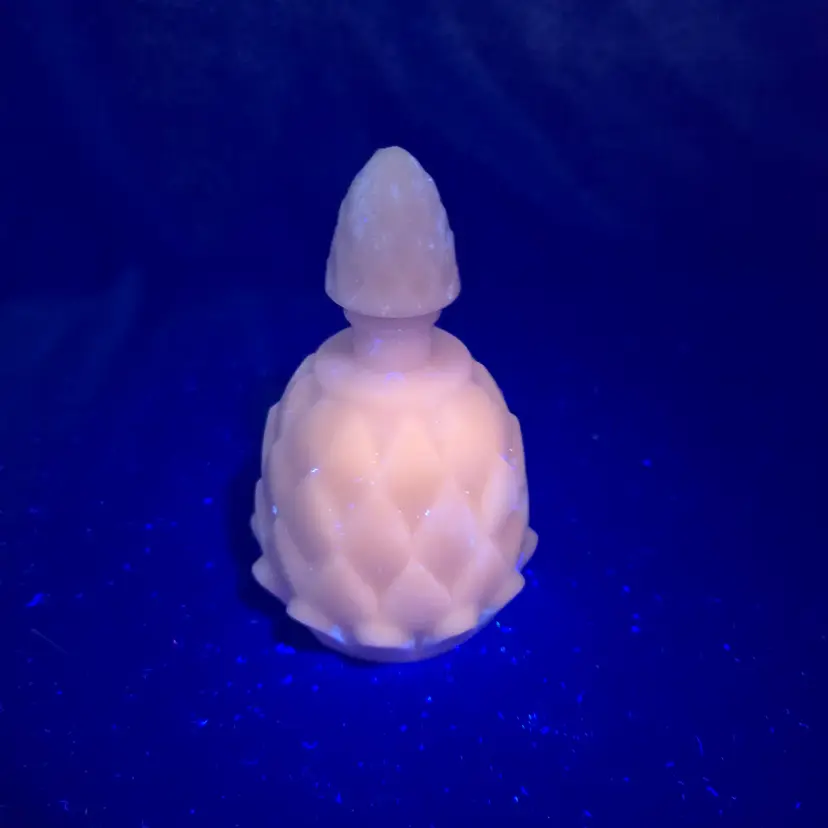 Gorgeous pink satin perfume bottle (empty) from France, incised mark. Glows orange under 365 UV. Flawless condition. No odors.