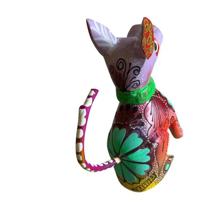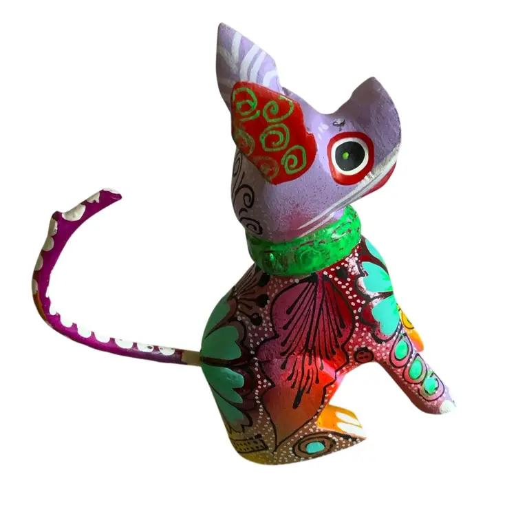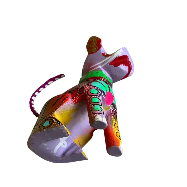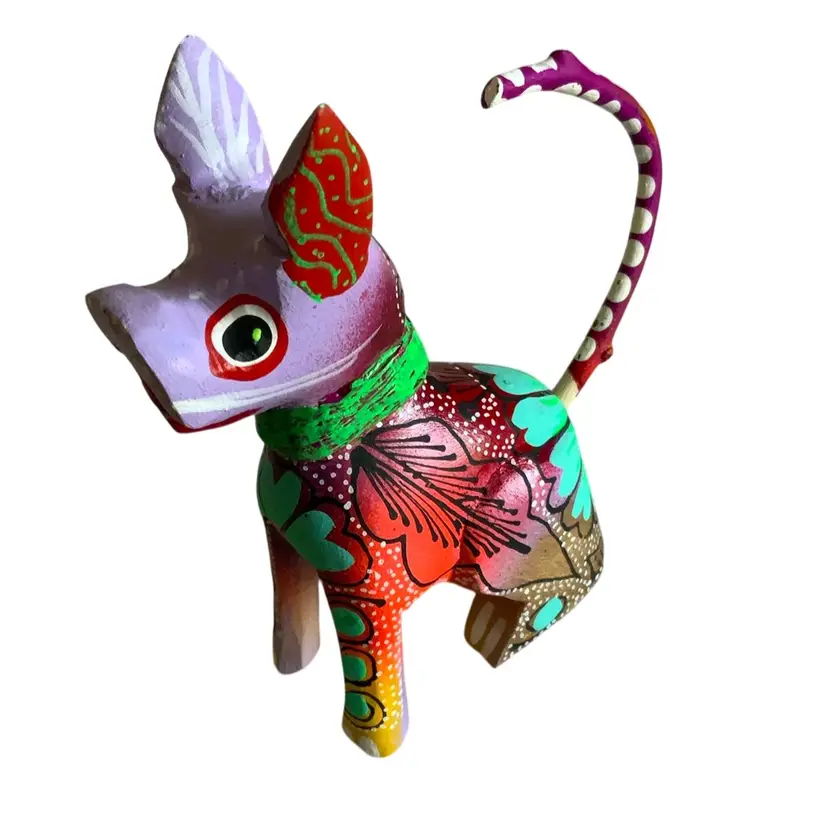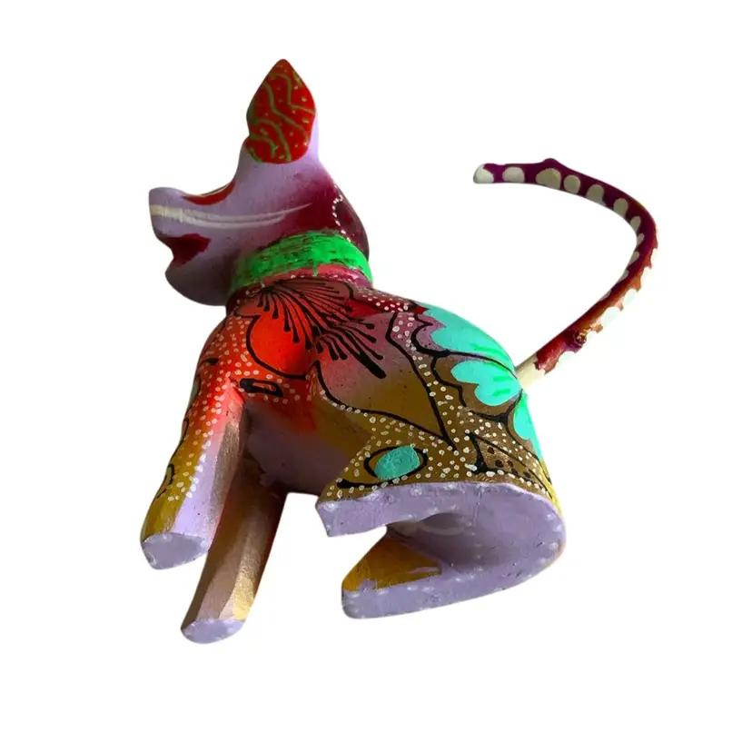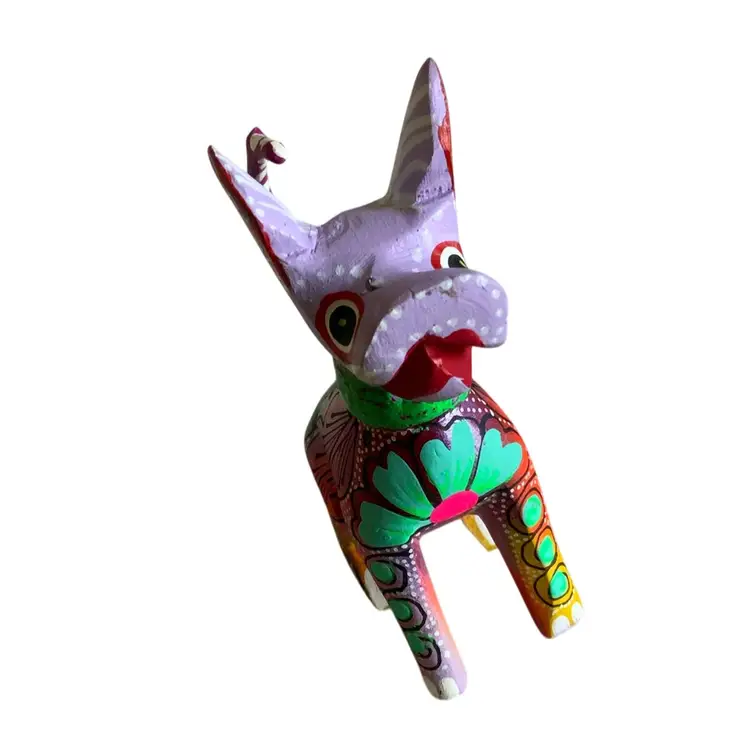 This is an Alebrije, a brightly colored Mexican folk art sculpture, specifically a coyote. Alebrijes are often made of wood and hand-painted with intricate patterns and vibrant colors. They represent fantastical creatures or animals and are considered to be spirit guides or protectors. 4β by 3.75β I make these critters and feel like I am not done. I reserve the right to add additional decoration. 4.5" by 3"