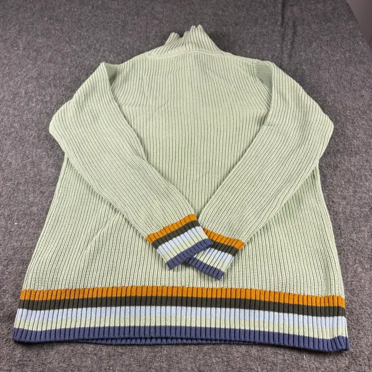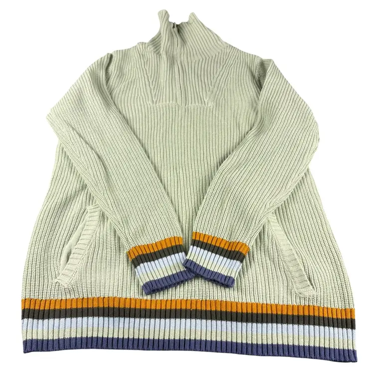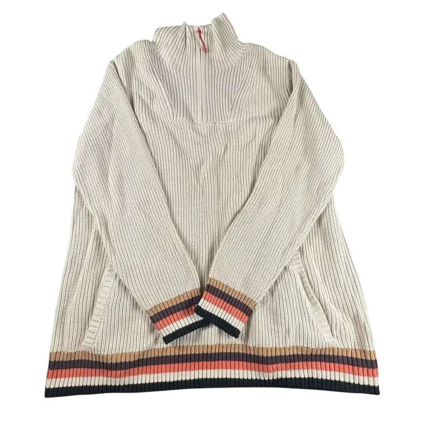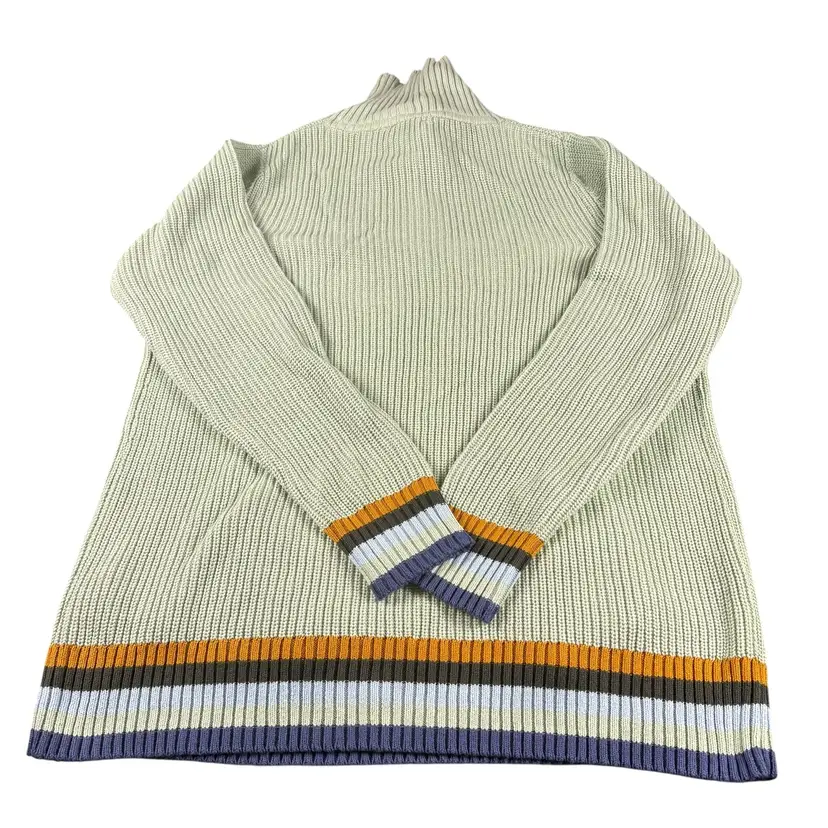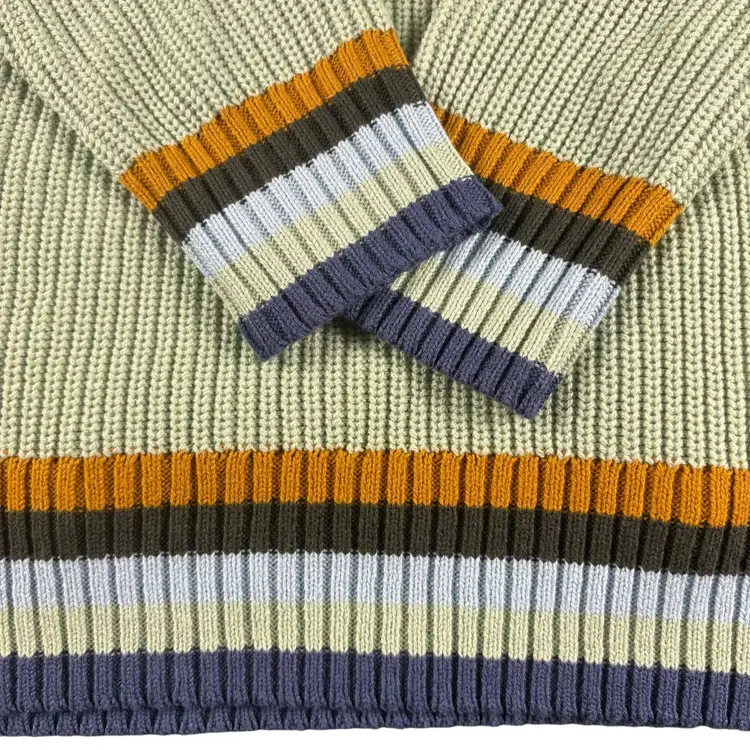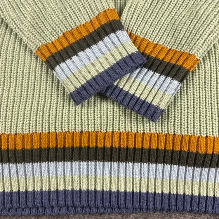 Style: Ribbed knit pullover with zip mock neck, long sleeves, striped hem and cuffs.