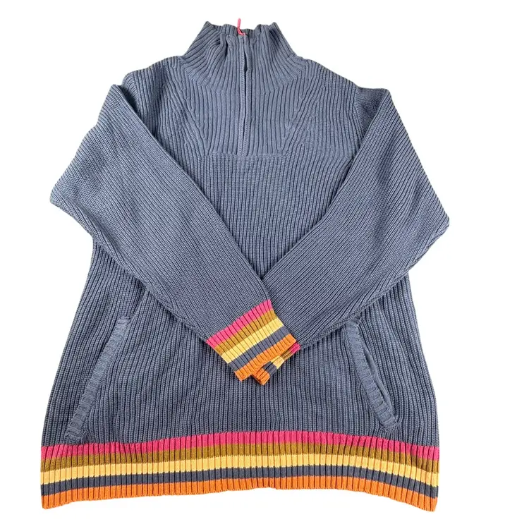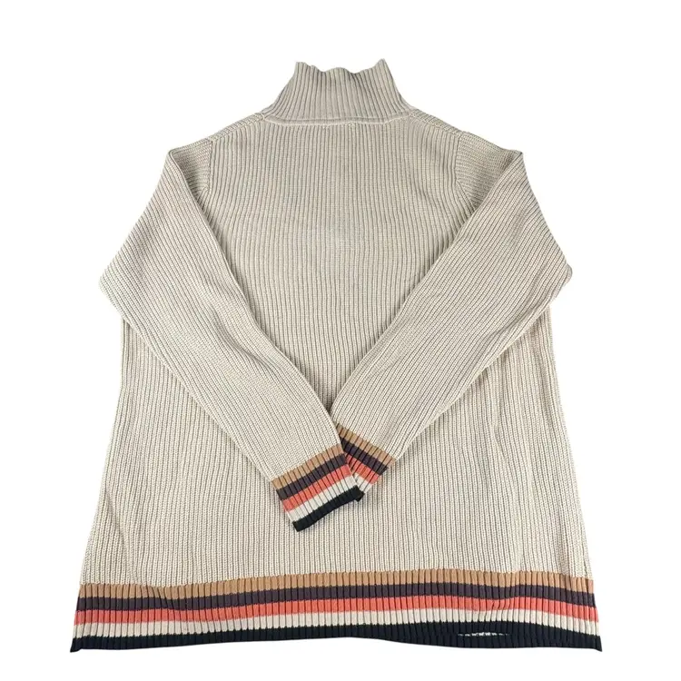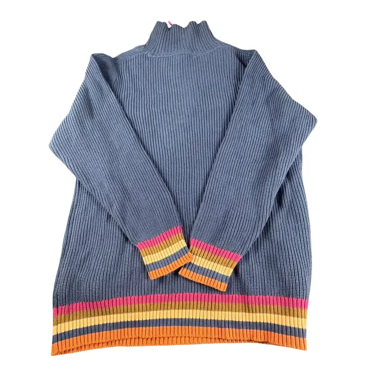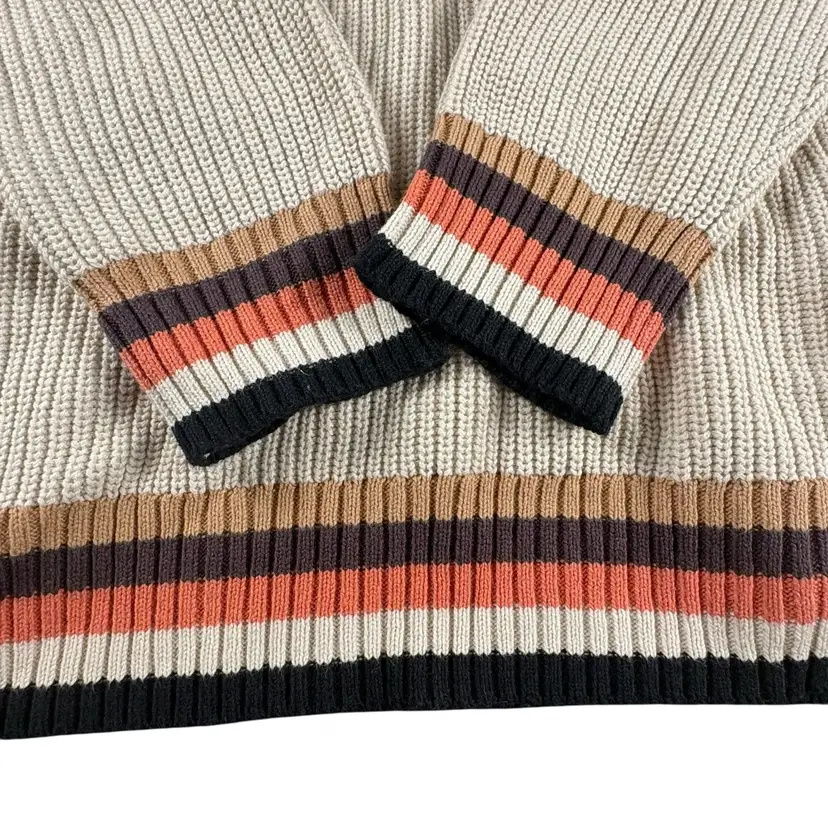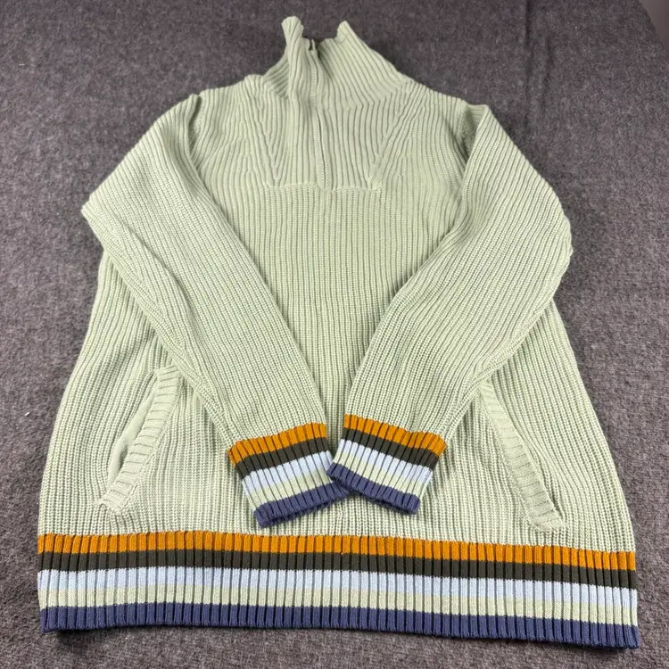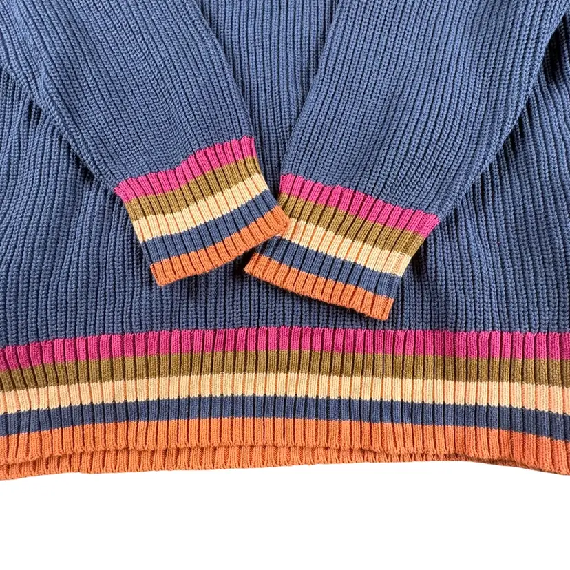 Style: Ribbed knit pullover with zip mock neck, long sleeves, striped hem and cuffs.
