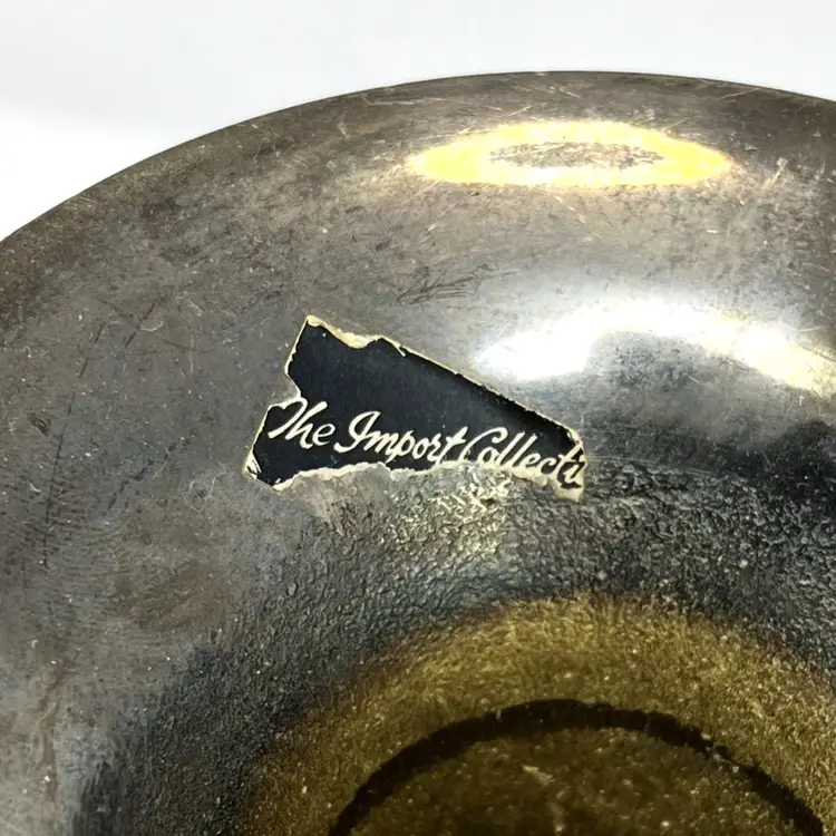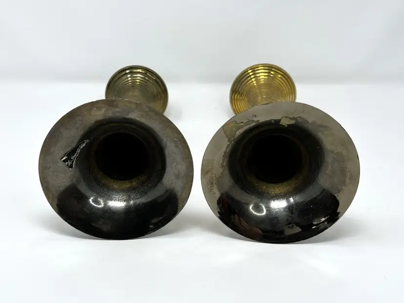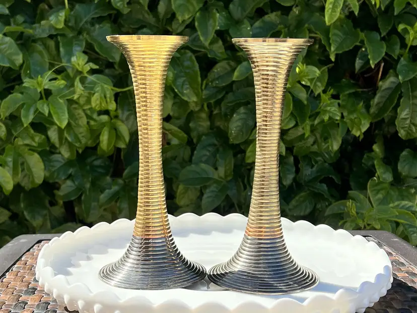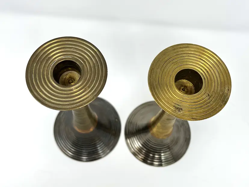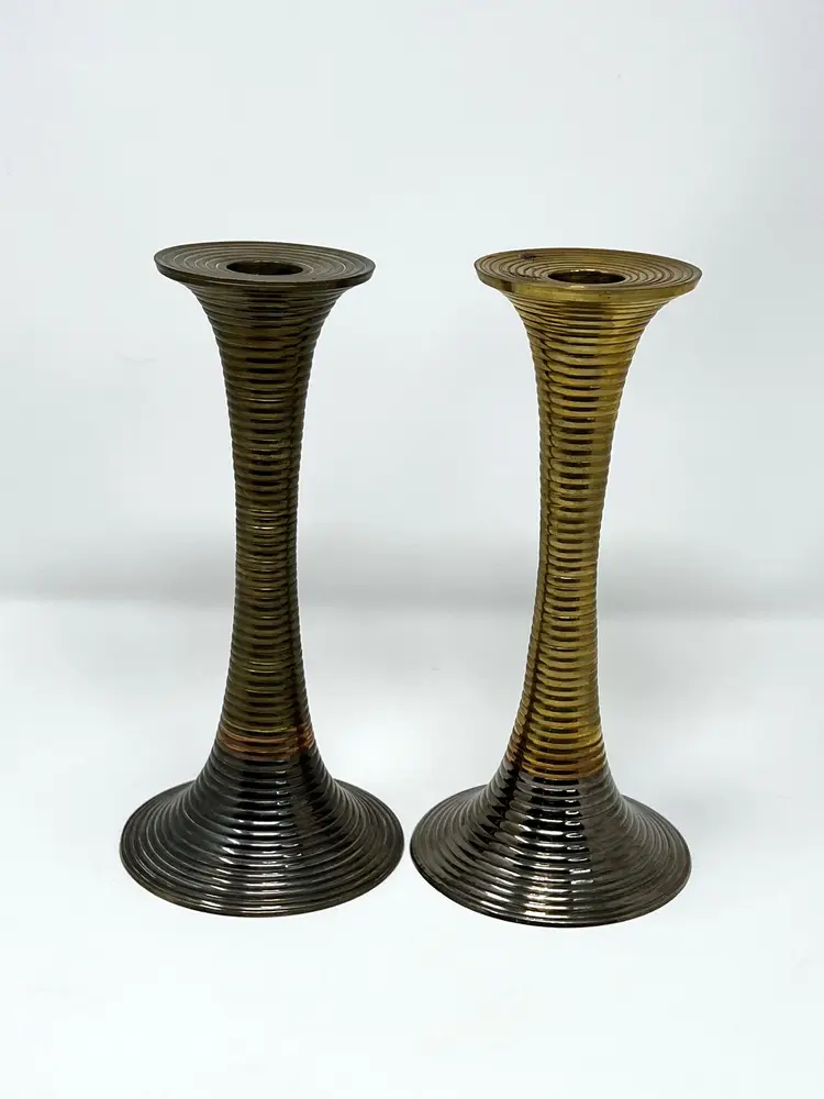 DETAILS: • Manufacturer: The Import Collection • Design/Pattern: Fluted taper holders with ribbed ring texture • Markings: Partial sticker “The Import Collection” (on one base) • Origin: India • Date/Era: 1970s–1980s • Design Style: Mid-century modern leaning into global/boho revival • Materials: Solid brass • Color(s): Tri-tone brass finish – natural brass, rose-gold, and silver wash • Dimensions: Height: 8.25", Top Diameter: 2.5", Base Diameter: 4", Weight: 12 oz each • Condition: Excellent vintage condition with only light age wear. Some minor surface scratches, faint scuffing, and a few very small dings along the base edge. Minimal oxidation