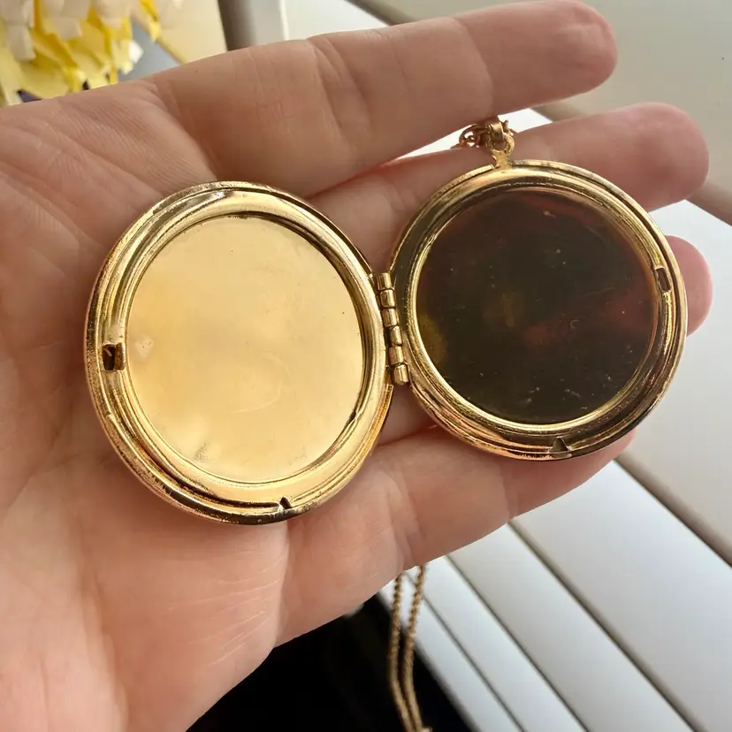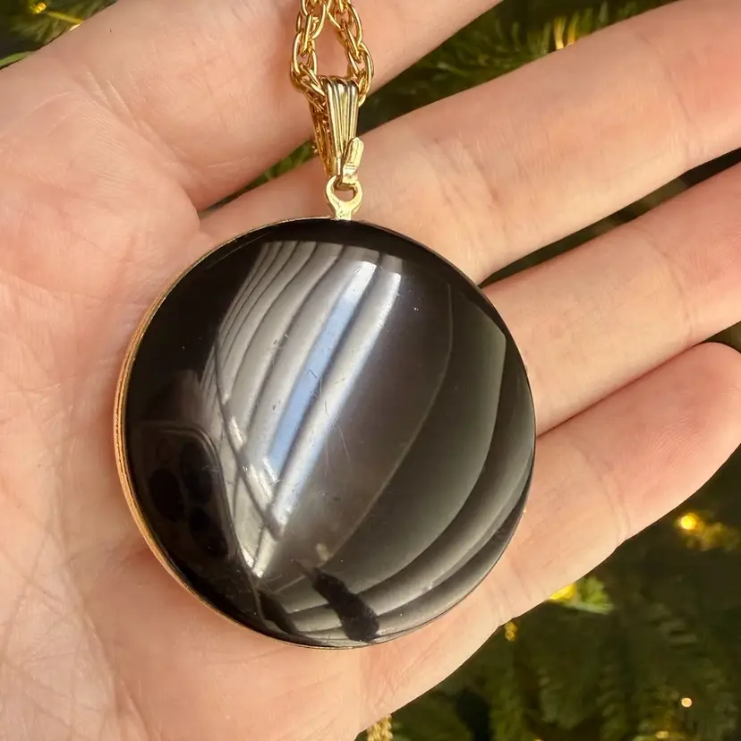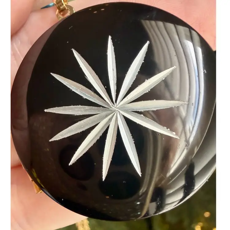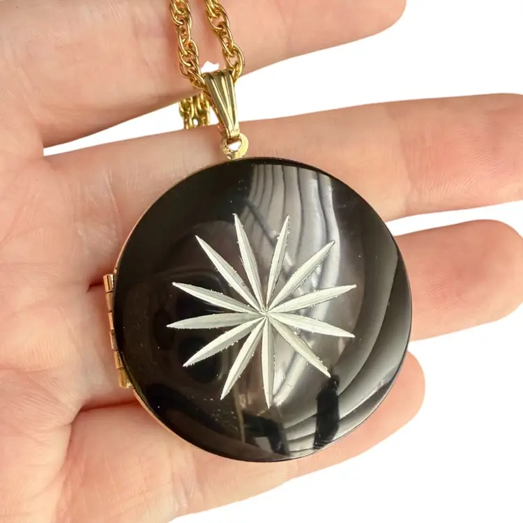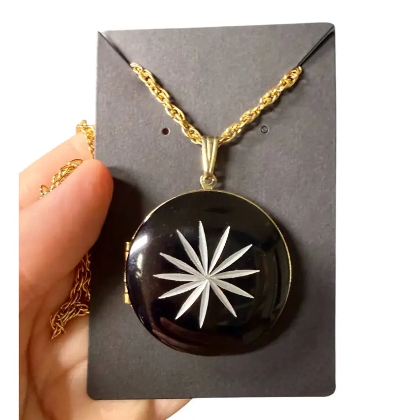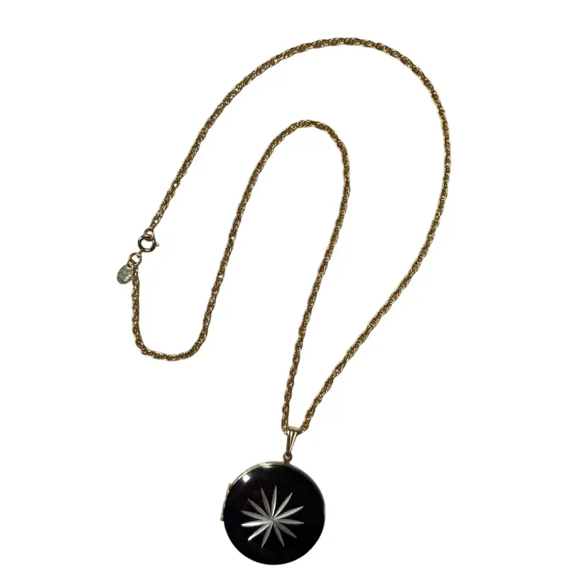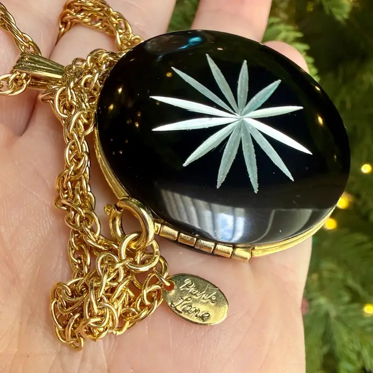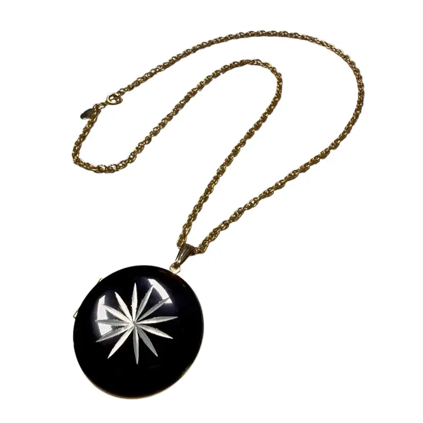 Chain: 24” - Locket: 1.5”. Vintage Park Lane locket necklace. Locket is a round, black enamel with a silver tone starburst carved into it. Closes securely yet easy to open. Has park lane metal tag near clasp. NOTE starburst edges have some slight wear/nicks, although very small. Please see photos.