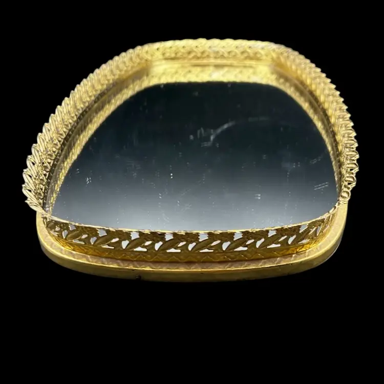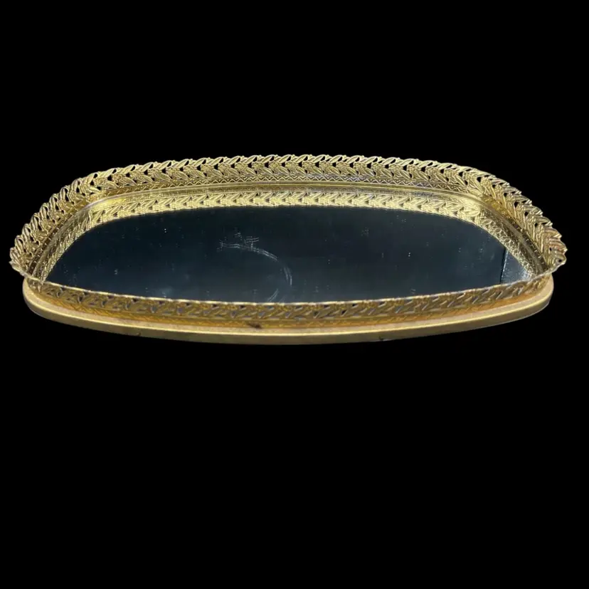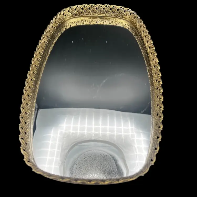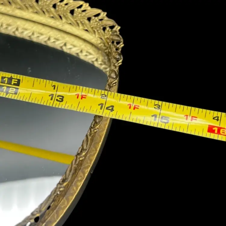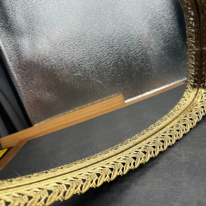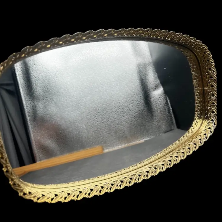 Vintage Gold Tone Hollywood Regency Vanity Mirror-Tray With Floral Design Rim Read - There Is A Light Bottle Bottom Scratch On The Mirror - Hard To Photograph, See Pictures. Padded back not footed Measures 14” x 8” x just over 1” frame/rim