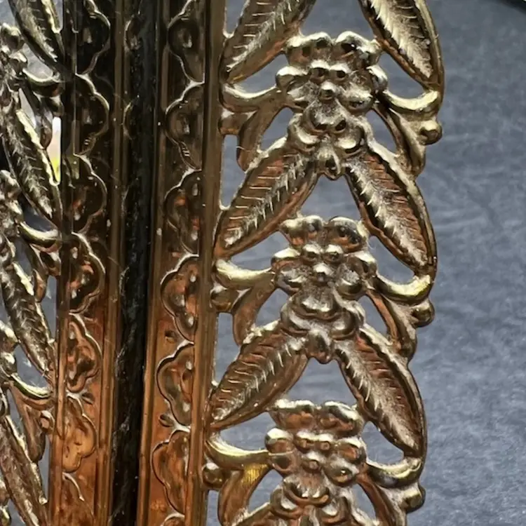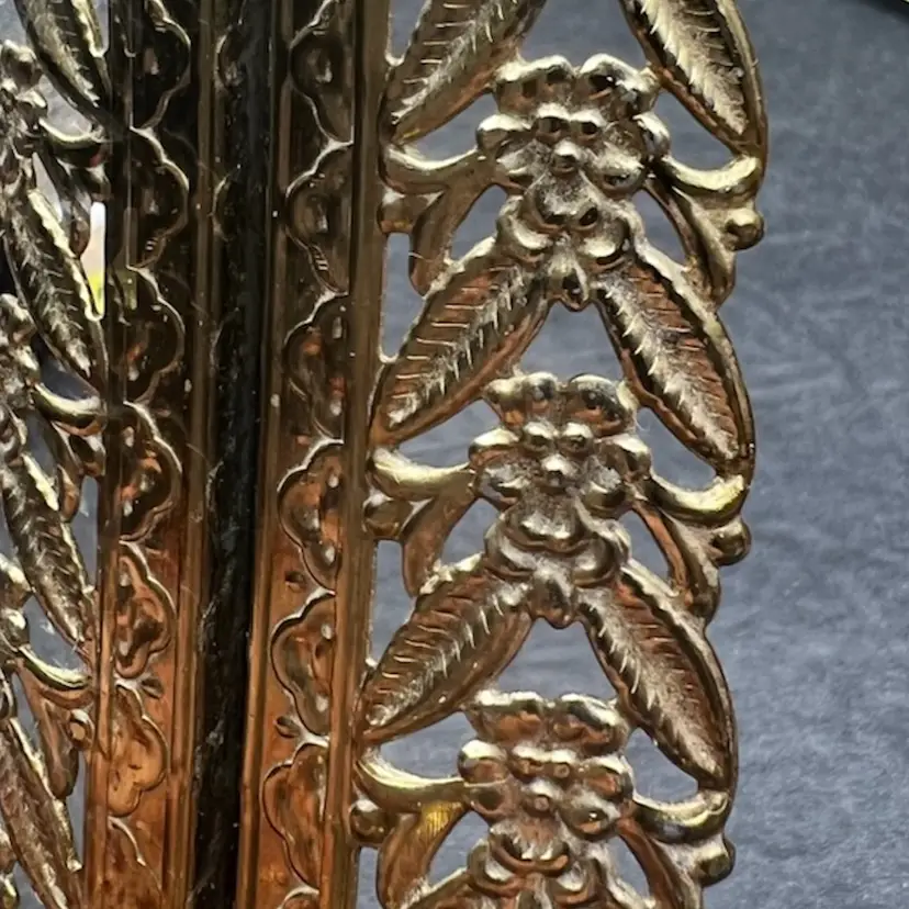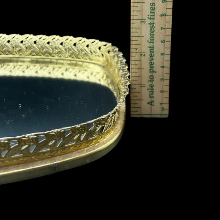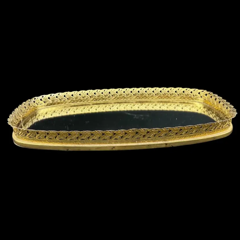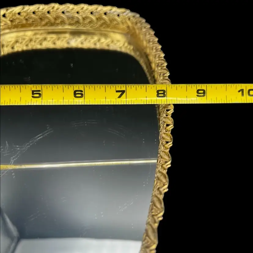 Vintage Gold Tone Hollywood Regency Vanity Mirror-Tray With Floral Design Rim Read - There Is A Light Bottle Bottom Scratch On The Mirror - Hard To Photograph, See Pictures. Padded back not footed Measures 14” x 8” x just over 1” frame/rim