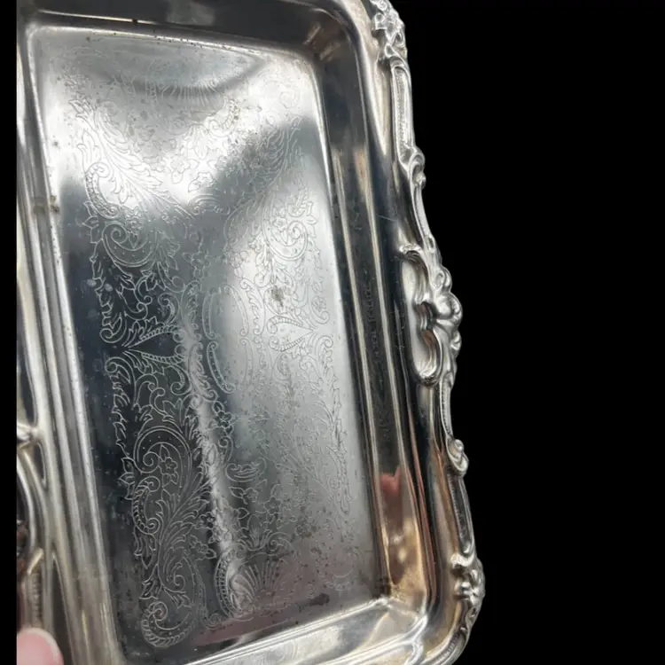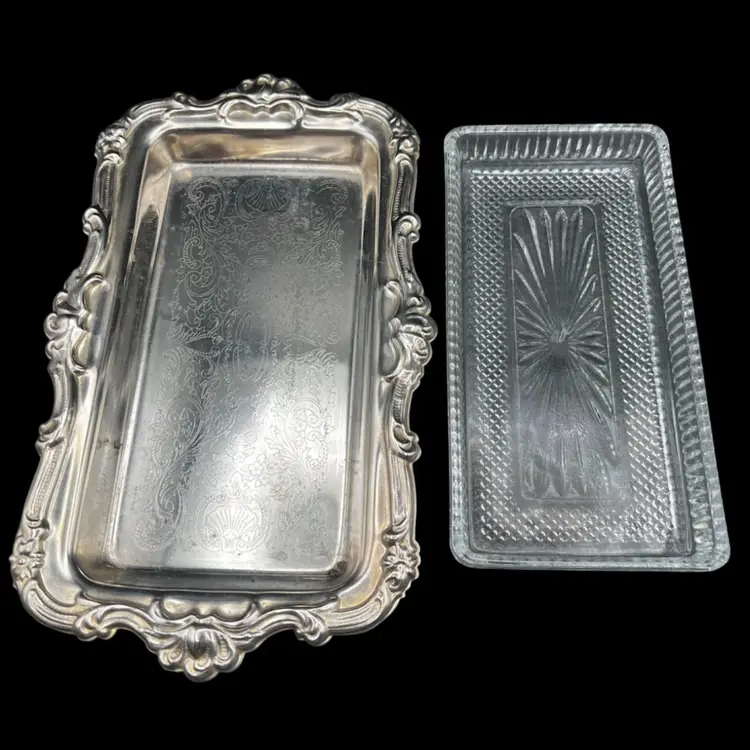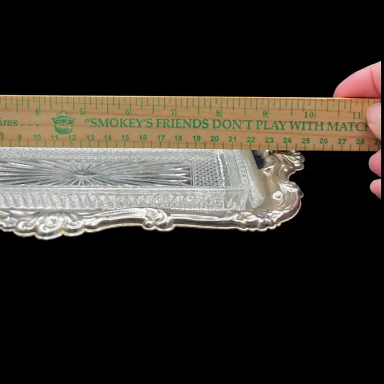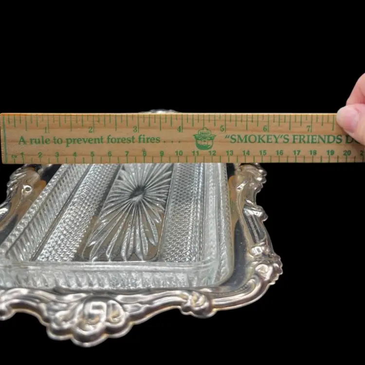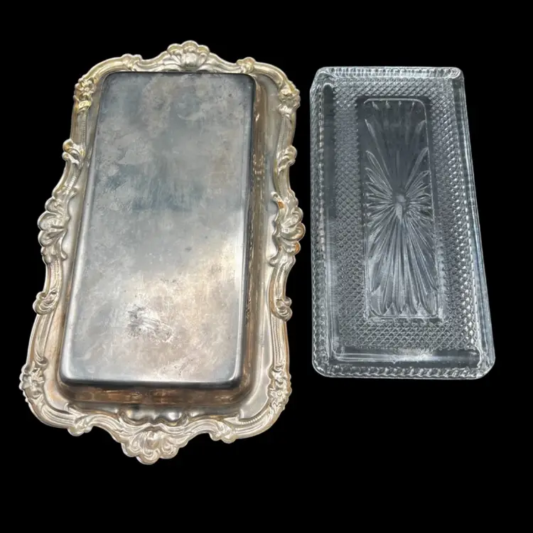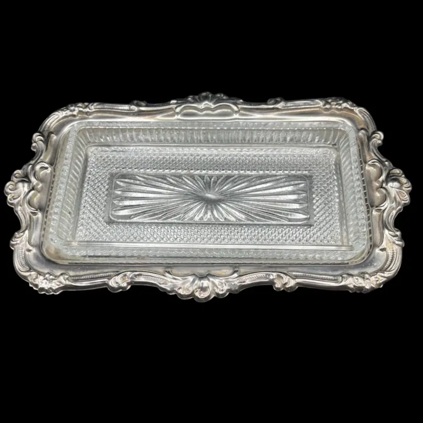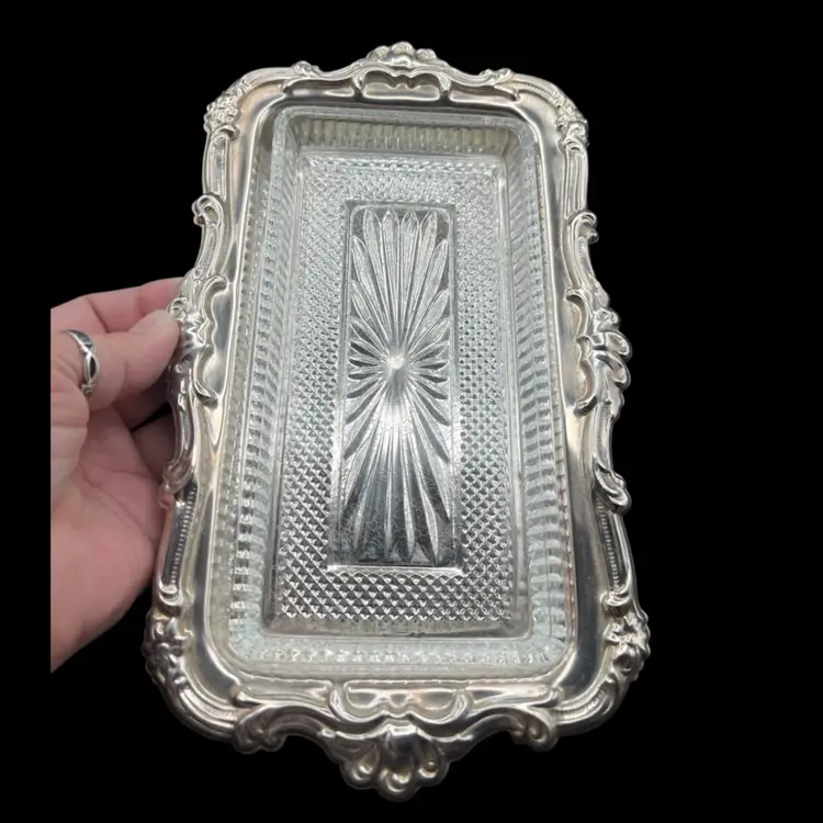 Vintage Fancy/Ornate Silverplate EP On Steel & Removable Cut Glass Butter/Relish Dish Made In Hong Kong In good vintage condition. A few spots of tarnish/wear on the tray. Glass insert is in excellent condition, no chips or cracks. Measures 10” x 6”